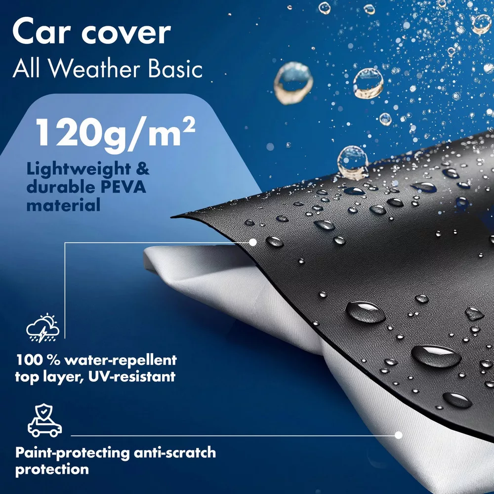 A ponyva 120 g/m²-es PEVA bevonatú, nem szőtt anyagból készült, ami vízállóvá teszi – nagy előny kültéri használatra. Ez megvédi járművét az esőtől, jégtől, hótól és egyéb szennyeződésektől, például portól, madárürüléktől, fagyantától és levelektől.