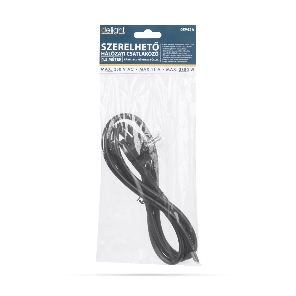Szerelhető tápkábel földeléssel és szereletlen kábelvégződéssel. A csatlakozón műanyag fül található, amely megkönnyíti a dugó leválasztását a hálózatról. Ideális lehet beltéren használatos eszközök hálózati árammal történő ellátására.