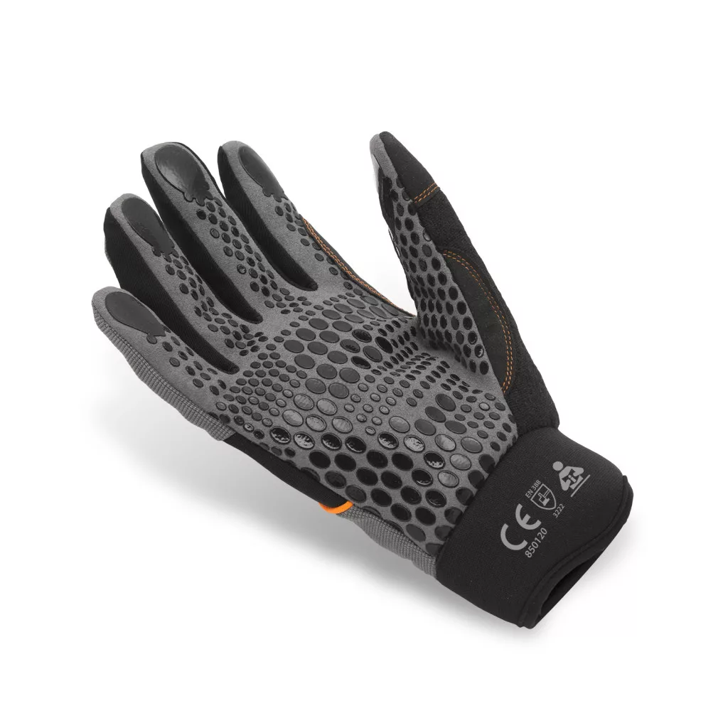 Kiváló fogásbiztonságot nyújtó kesztyű profiknak. Szilikon bevonatú tenyérrel, megerősített varrásokkal és lélegző ujjkialakítással.