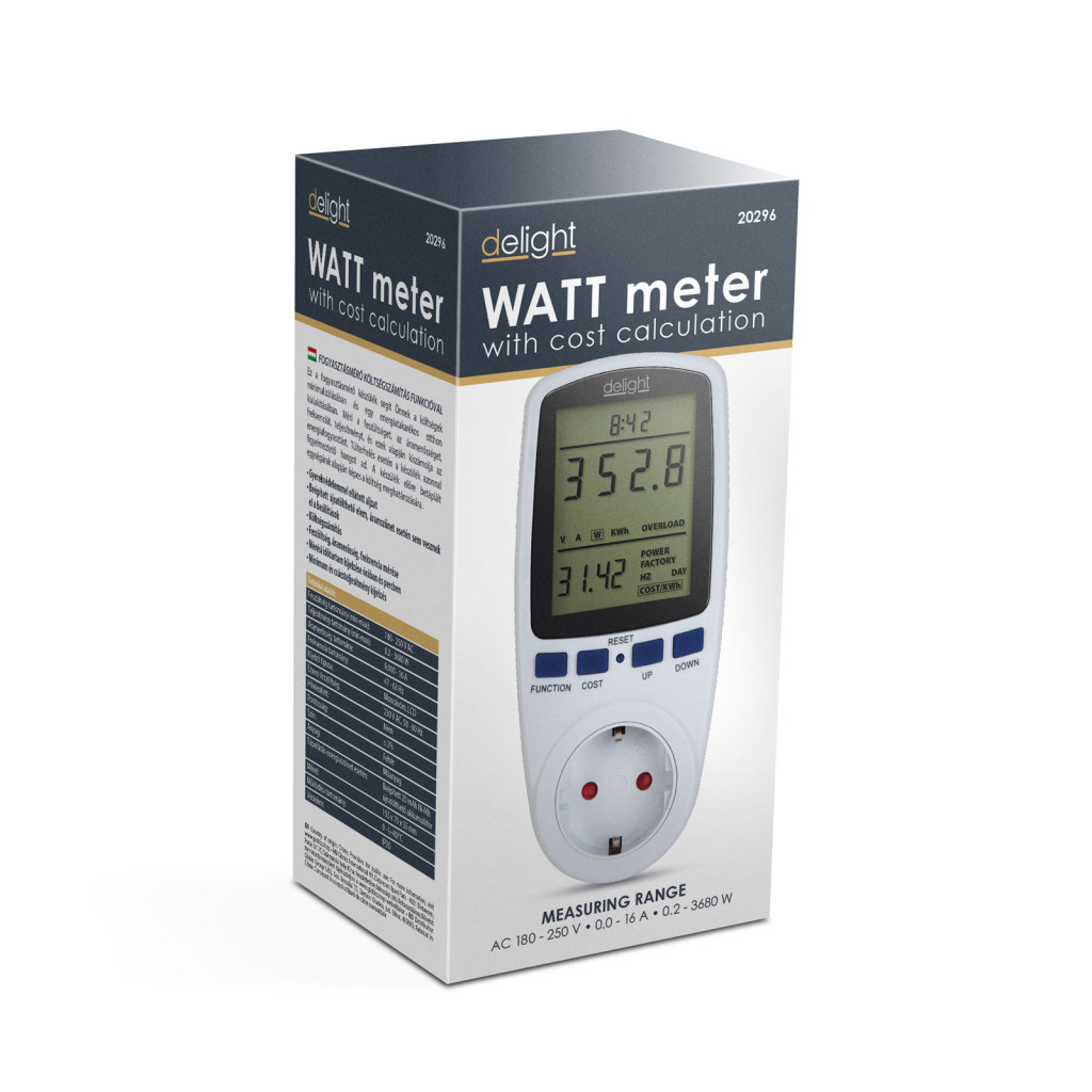 Ez a fogyasztásmérő készülék segít Önnek a költségek minimalizálásában és egy energiatakarékos otthon kialakításában. Méri a feszültséget, az áramerősséget, frekvenciát, teljesítményt, és ezek alapján kiszámolja az energiafogyasztást. Túlterhelés esetén a készülék azonnal figyelmeztető hangot ad. A készülék előre betáplált egységárak alapján képes a teljes költség meghatározására.