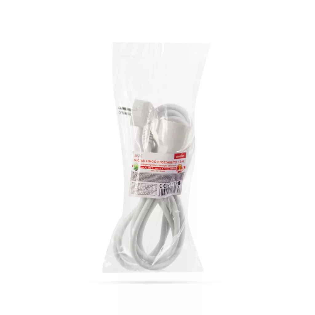 Általános, fehér hálózati lengő hosszabbító, amely használata javasolt háztartásban, irodákban. Jó minőségű, vastag szigetelése megvédi a kábelt a sérülésektől, a kábel esetleges megtörésétől. 90°-os dugóval rendelkezik.