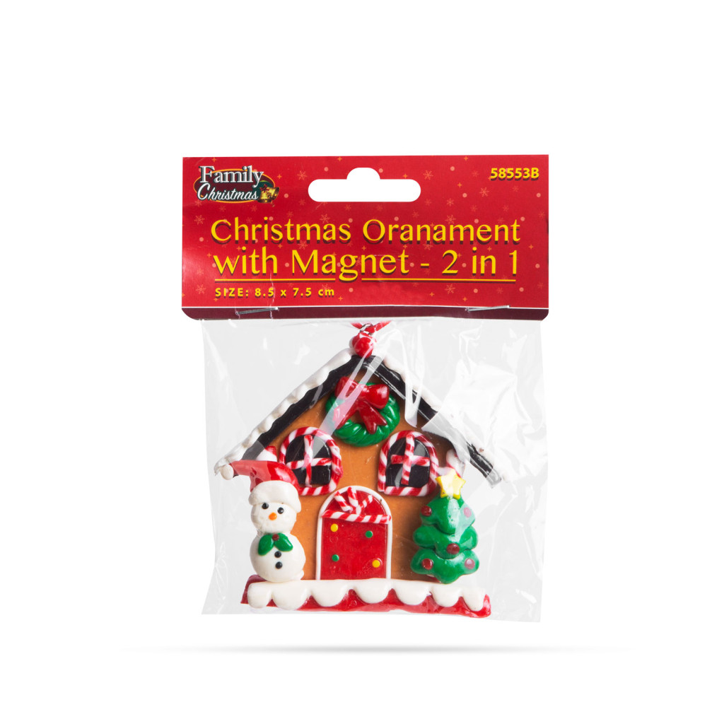 Karácsonyi mágneses dekoráció - 2 az 1-ben - mézeskalács házikó hóemberrel - 85 x 75 mm
