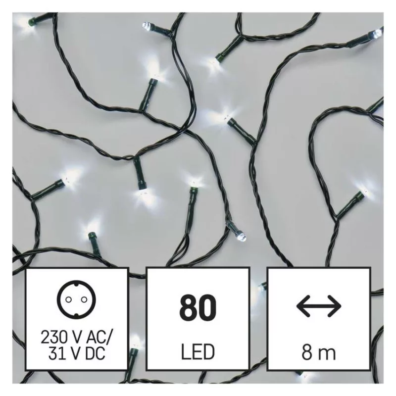 LED karácsonyi fényfüzér, 8 m, kültéri és beltéri, hideg fehér, progr, időz.