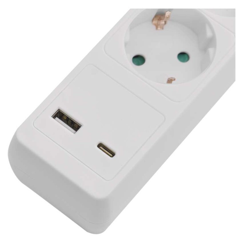Hosszabbító 2 m / 3 aljzat / kapcsolós / fehér / 1× USB-A + 1× USB-C  / 1,5 mm2