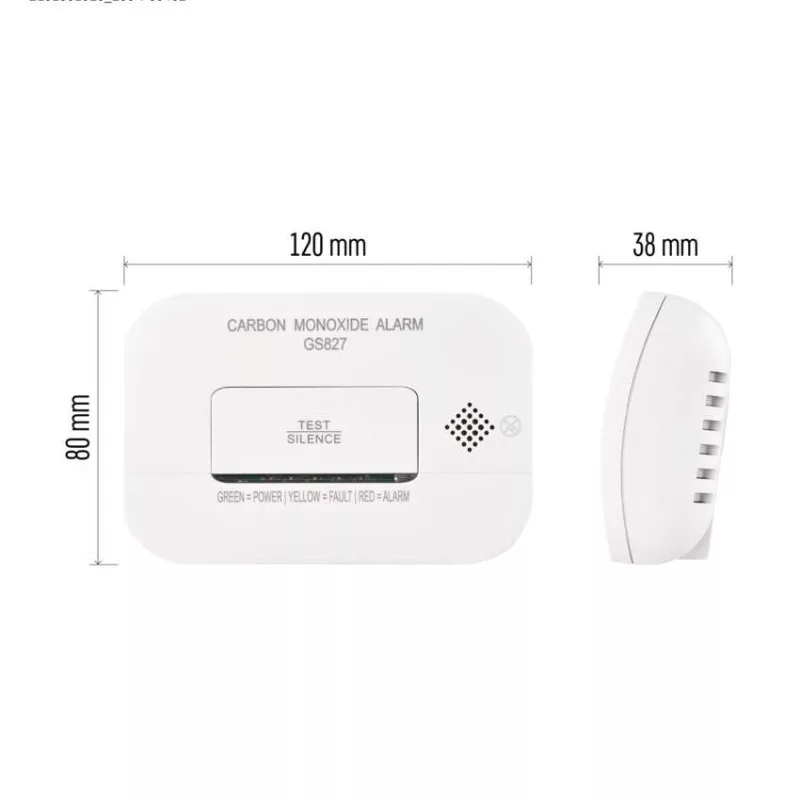 a következő típusú: nincs megadva|élettartam: 10 év|értékesítési csomagolás: 1 db, kis doboz|észlelés típusa: detektor CO|felszerelés típusa: falra szerelhető vagy álló|jelátviteli frekvencia: nincs megadva|jelzési hangerő: >85 dB, 3 m-es távolságról|jelzés típusa: optikai és hang|méretek: 38 × 120 × 80 mm|modul hatóköre: nincs megadva|riasztási hőmérséklet: –|riasztások memóriaája: nincs megadva|táplálás: 2× 1,5 V AA, tartozék|további érzékelőkhöz csatlakoztatható: nincs megadva|üzemi hőmérséklet: -10 °C és 40 °C|üzemi nedvességtartalom: 30–95 %|védettség: IP30