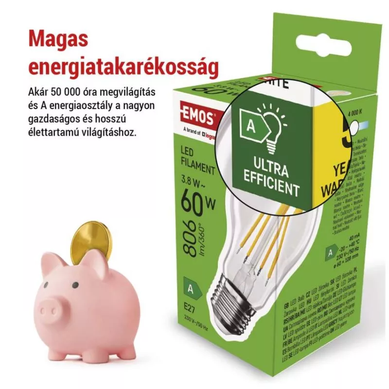 chipek száma: 4|chipek típusa: COB|dimmelhető: nem|élettartam: 50 000 óra|energiaosztály: A|értékesítési csomagolás: 1 db, kis doboz|értesítések a mobilalkalmazáshoz: –|fényáram: 806 lm|fényhasznosítás: 212 lm/W|fény színe: természetes fehér|feszültség: 230 V~/50 Hz|foglalat: E27|fogyasztás: 3,8 W|forma: A60|garancia-időszak: 5 év|hangalapú asszisztensek általi vezérlés: –|helyettesítő: 60 W|jelátviteli frekvencia: –|kapcsolási ciklusok száma: 30 000|kompatibilitás: –|méretek: 60 × 60 × 108 mm|protokoll: –|sorozat: FILAMENT|sugárzási szög: 360°|színhőmérséklet: 4 000 K|színvisszaadási index (CRI): Ra >80|támogatott OS: –|technológia: LED|teljesítménytényező: 0,5