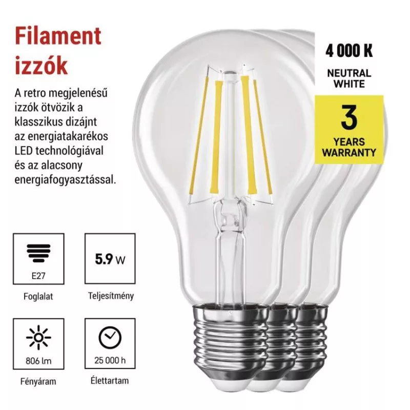 chipek száma: 4|chipek típusa: COB|dimmelhető: nem|élettartam: 25 000 óra|energiaosztály: D|értékesítési csomagolás: 3 db, doboz|értesítések a mobilalkalmazáshoz: nincs megadva|fényáram: 806 lm|fényhasznosítás: 137 lm/W|fény színe: természetes fehér|feszültség: 230 V~/50 Hz|foglalat: E27|fogyasztás: 5,9 W|forma: A60|garancia-időszak: 3 év|hangalapú asszisztensek általi vezérlés: nincs megadva|helyettesítő: 60 W|jelátviteli frekvencia: nincs megadva|kapcsolási ciklusok száma: 25 000|kompatibilitás: nincs megadva|méretek: 60 × 60 × 108 mm|protokoll: nincs megadva|sorozat: FILAMENT|sugárzási szög: 360°|színhőmérséklet: 4 000 K|színvisszaadási index (CRI): Ra >80|támogatott OS: nincs megadva|technológia: LED|teljesítménytényező: 0.50