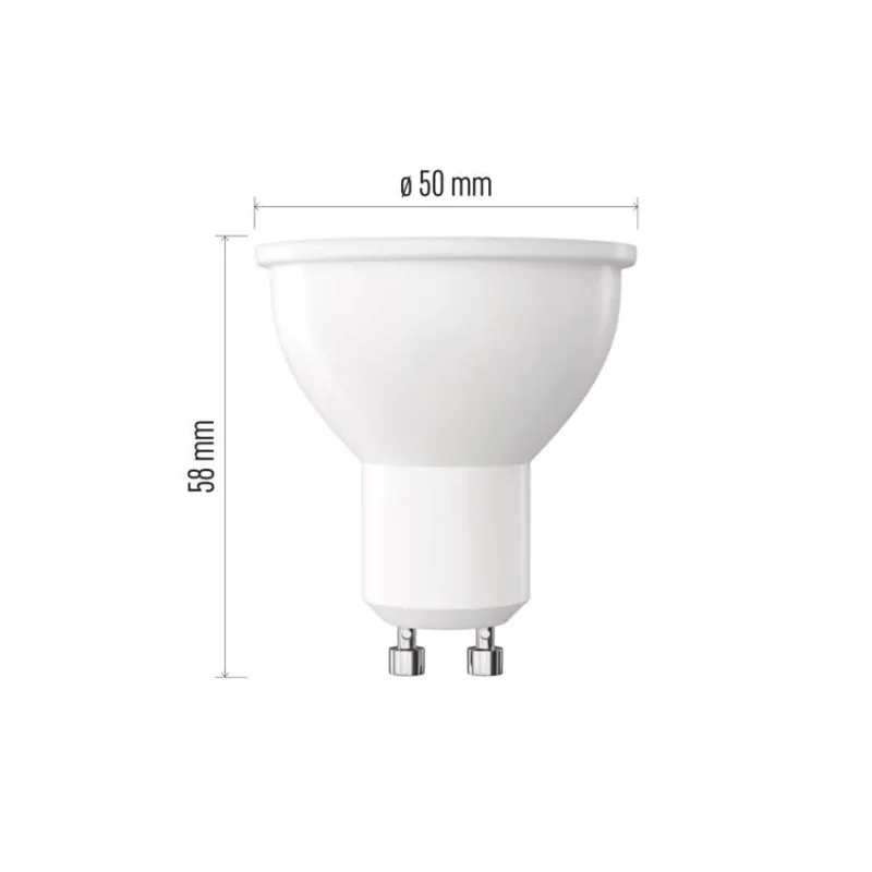 chipek száma: nincs megadva|chipek típusa: SMD|dimmelhető: igen|élettartam: 25 000 óra|energiaosztály: E|értékesítési csomagolás: 1 db, kis doboz|értesítések a mobilalkalmazáshoz: –|fényáram: 800 lm|fényhasznosítás: 114 lm/W|fény színe: meleg fehér|feszültség: 230 V~/50 Hz|foglalat: GU10|fogyasztás: 7 W|forma: MR16|garancia-időszak: 3 év|hangalapú asszisztensek általi vezérlés: –|helyettesítő: 60 W|jelátviteli frekvencia: –|kapcsolási ciklusok száma: 25 000|kompatibilitás: –|méretek: 50 × 50 × 58 mm|protokoll: –|sorozat: CLASSIC|sugárzási szög: 100°|színhőmérséklet: 3 000 K|színvisszaadási index (CRI): Ra >80|támogatott OS: –|technológia: LED|teljesítménytényező: 0.93