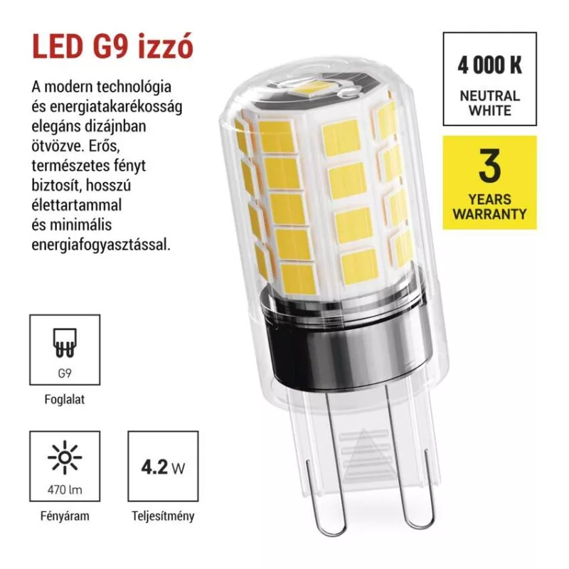 chipek száma: –|chipek típusa: SMD|dimmelhető: nem|élettartam: 30 000 óra|energiaosztály: E|értékesítési csomagolás: 1 db, kis doboz|értesítések a mobilalkalmazáshoz: –|fényáram: 470 lm|fényhasznosítás: 112 lm/W|fény színe: természetes fehér|feszültség: 220-240 V~|foglalat: G9|fogyasztás: 4,2 W|forma: JC|frekvencia: 50/60 Hz|garancia-időszak: 3 év|hangalapú asszisztensek általi vezérlés: –|helyettesítő: 40 W|jelátviteli frekvencia: –|kapcsolási ciklusok száma: 25 000|kompatibilitás: –|méretek: 18 × 18 × 49 mm|protokoll: –|sorozat: CLASSIC|sugárzási szög: 300°|színhőmérséklet: 4 000 K|színvisszaadási index (CRI): Ra >80|támogatott OS: –|technológia: LED|teljesítménytényező: 0,40