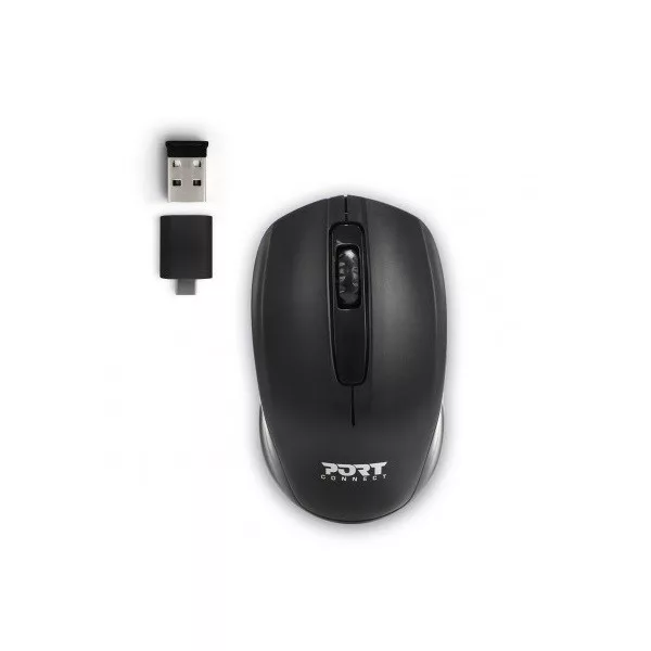 The wireless mouse comes with a USB-A dongle and a USB-A to USB-C converter. It incorporates 2.4Ghz wireless technology. It is compatible with Windows, Mac OS and Android operating systems. It has 3 buttons and a scroll wheel.