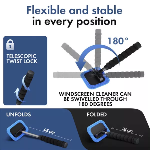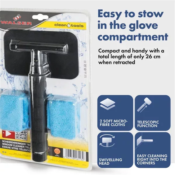 A teleszkópos ablaktisztító lehetővé teszi a szélvédő gyors és egyszerű tisztítását. 26 és 42 cm között állítható. A mikroszálas párnák megbízhatóan felszívják a nedvességet az üvegről, csíkozásmentes eredményt biztosítva. Az ablaktisztító speciális jellemzője a kihúzható fogantyú, amely a kívánt hosszúságban rögzíthető. Ez lehetővé teszi, hogy kényelmesen elérje a szélvédő teljes felületét.