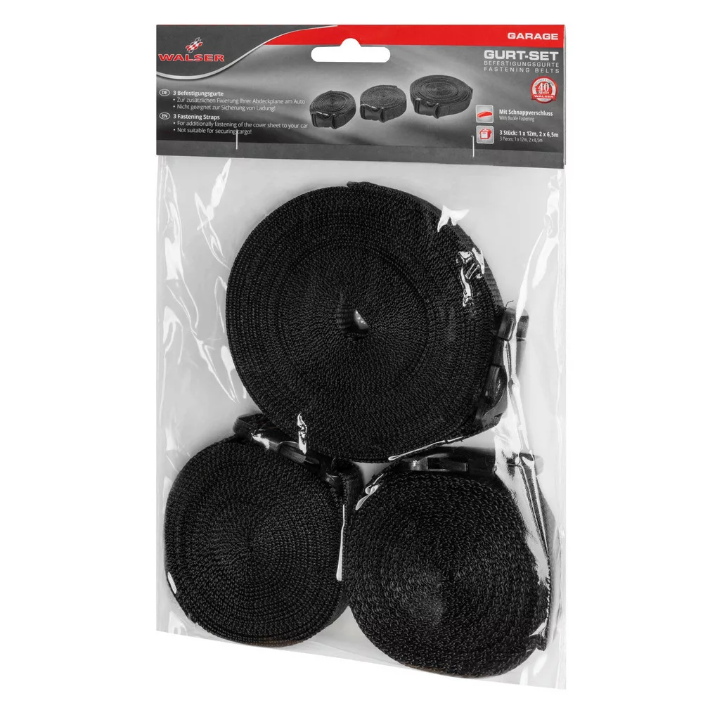 A 3 részes készlet 2 db 6,5 méter hosszú és egy 12 méter hosszú övből áll. A két rövidebb pánt a motorháztetőre (az első kerek mögött) és a csomagtartóra javasolt (hátsó kerekek mögött). A 12 méter hosszú heveder az autó közepén való rögzítésre szolgál a tető fölött áthúzva. Mindhárom pánt praktikus, állítóval ellátott, patentos rögzítőkkel rendelkezik és nagyon jól feszíthető!