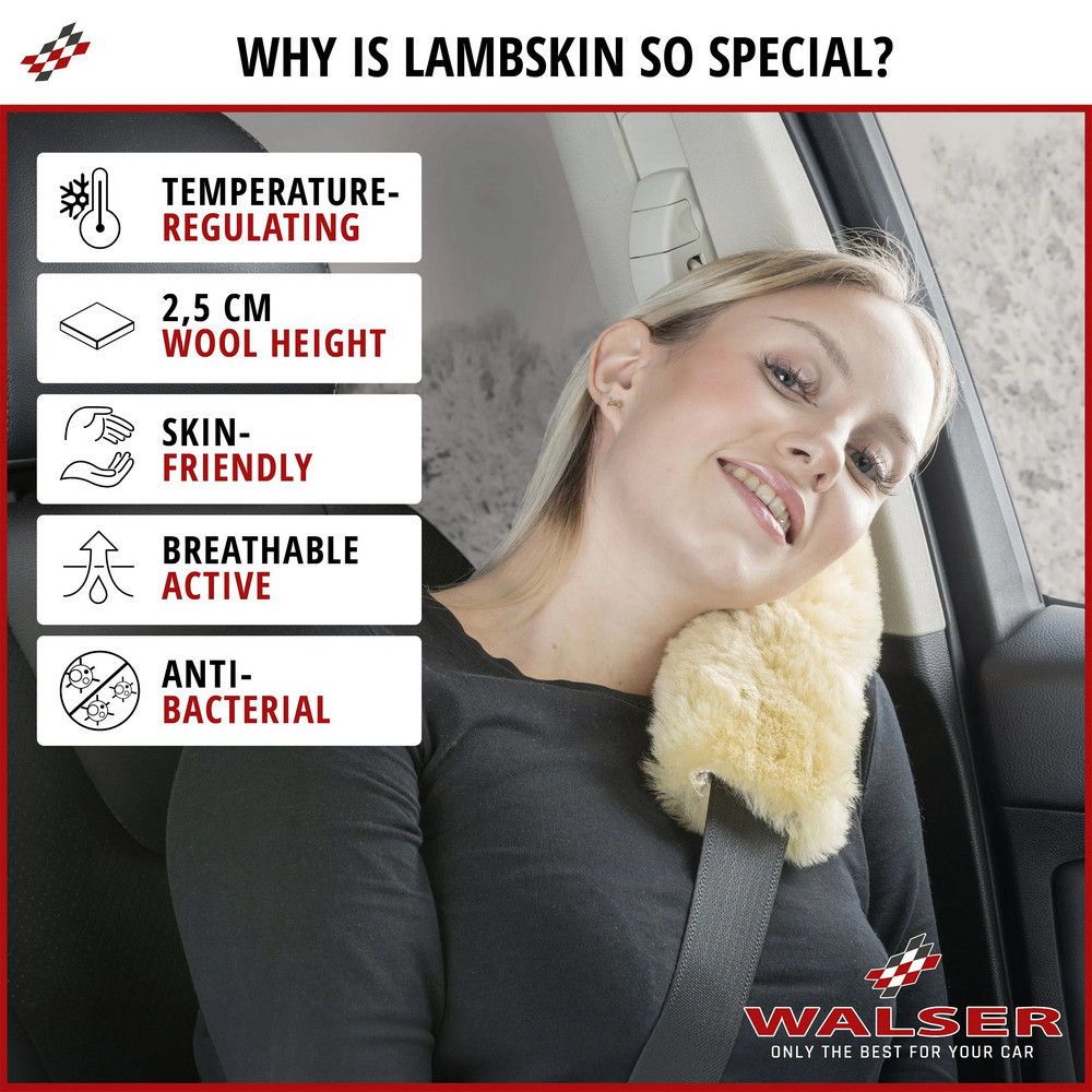 Különösen kiváló minőségű báránybőrt választottunk, amely ölelnivalóan puha, 25 mm-es gyapjúmagassággal. A báránybőr hőmérséklet-szabályozó tulajdonságokkal rendelkezik, és sok nedvességet képes felszívni. Ez kifejezetten csökkenti a bosszantó izzadást. Ezenkívül kényelmes légkört biztosít az autódnak, és csábít az összebújásra.