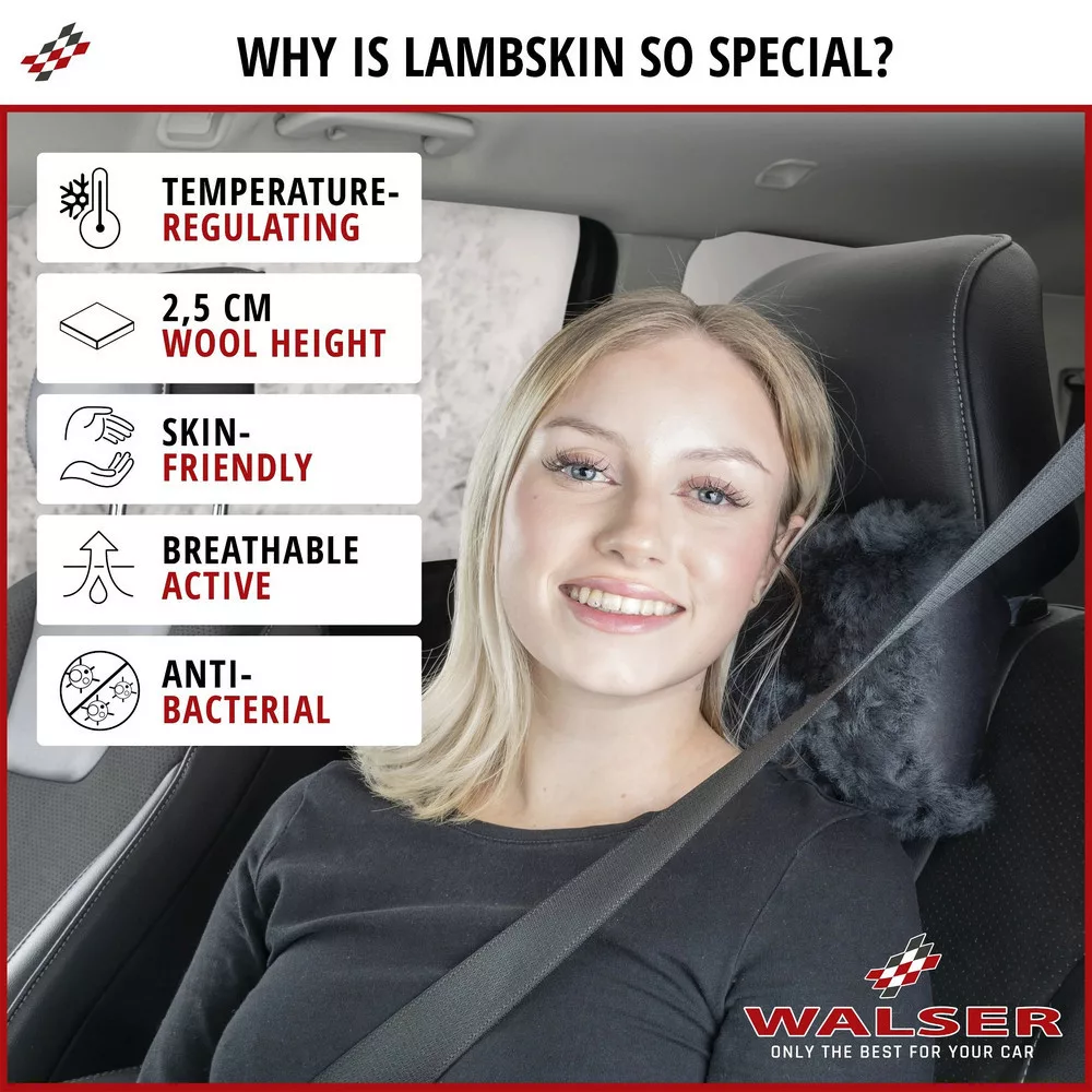 A támaszték tökéletes kiegészítője minden autónak, és nyugodt üléshelyzetet biztosít. Hangulatos báránybőrével csábít, és minden utazás során optimális támogatást nyújt a nyaknak. A nyaktámasz valódi, gyönyörű báránybőrből készült, a gyapjú magassága 25 mm. A betét hátoldalát textil borítja. A báránybőr hőmérsékletszabályozó tulajdonságokkal rendelkezik, és sok nedvességet képes felszívni. Ez biztosítja, hogy nyáron kevesebbet izzad, télen pedig kellemesen meleg marad. Ha a párnahuzat valaha is tisztításra szorul, a hátulján lévő cipzáron keresztül levehető, és kézzel mosható.
