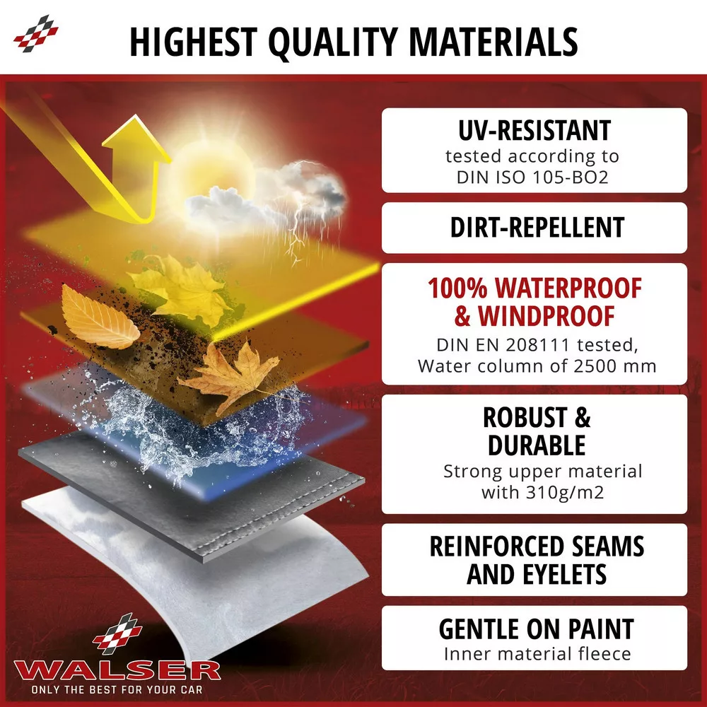 100%-ban vízálló DIN EN 208111 tesztnek megfelelően, robosztus anyag (310 g/m2), UV-álló, DIN ISO 105-BO2 tesztnek megfelelően!