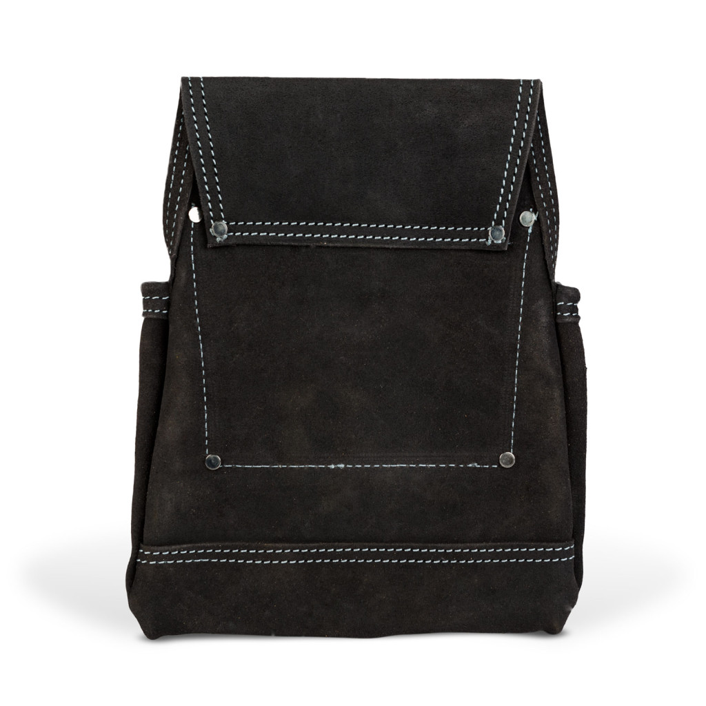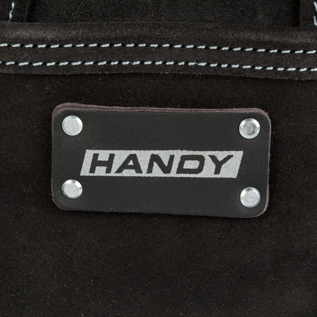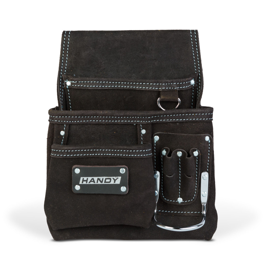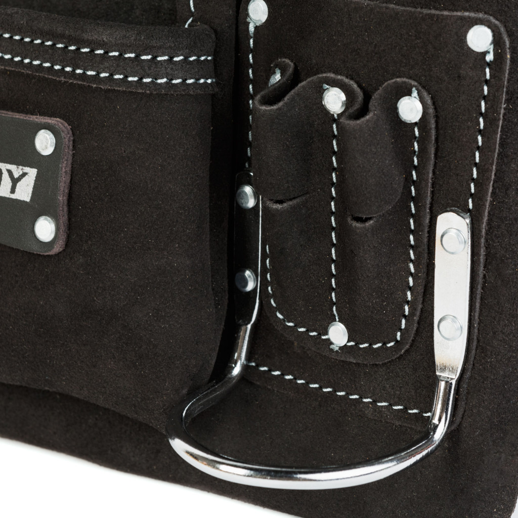 Hasított bőrből készült övtáska 2 nagy zsebbel, 2 akasztóhurokkal, övvel és 4 kisebb tárolóval (pl. ceruzának). Strapabíró kivitel, fém szegecsekkel erősítve.