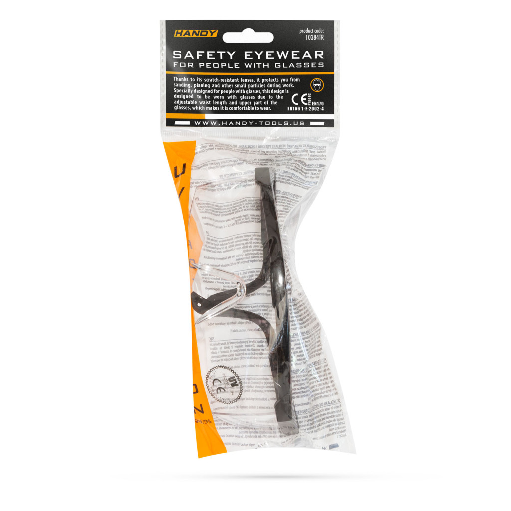 A karcolódásmentes lencséknek köszönhetően munkavégzés közben védelmet nyújt csiszolás, gyalulás és egyéb munkák során keletkező apró szemcsék ellen. Ez a kivitel kifejezetten szemüveges emberek részére készült, az állítható szárhossznak és a szemüveg felső részének kiképzése miatt, kényelmesen hordható látást segítő szemüveggel együtt, de akár anélkül is használható.