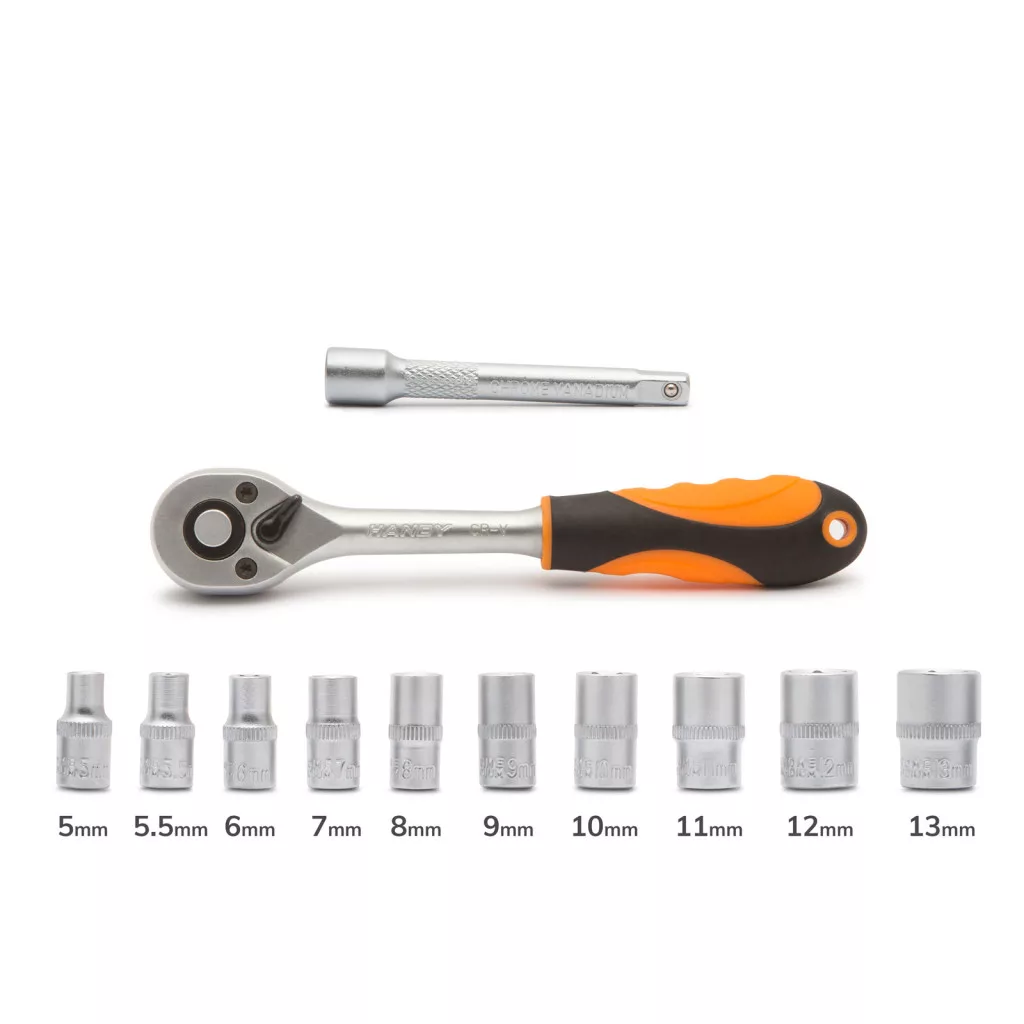12 darabos racsnis dugókulcs készlet. 5 mm-es fejtől 13 mm-es fejig. A gumírozott nyél kényelmes fogást biztosít, a kompakt méretnek és a toldóelemnek köszönhetően nehezen hozzáférhető, kis helyeken is könnyen használható.