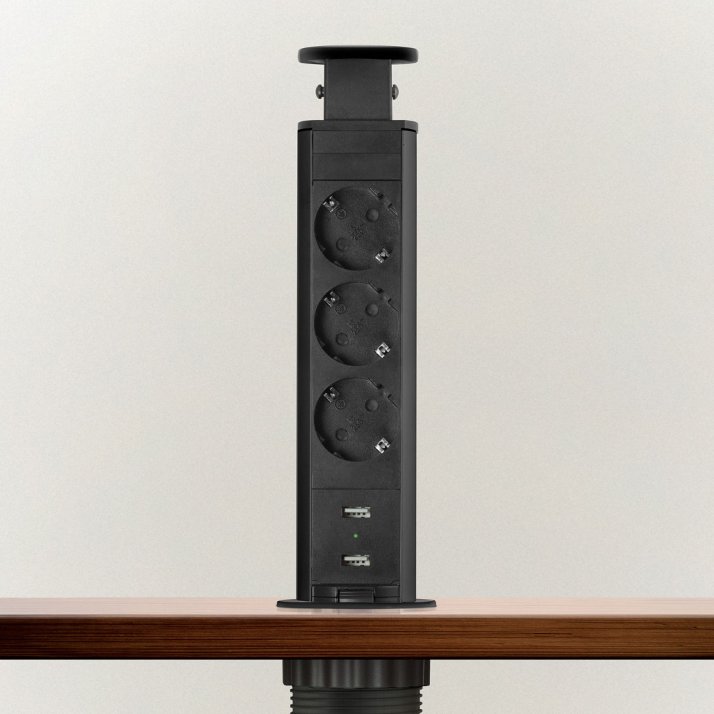 Süllyeszthető elosztó irodai és otthoni felhasználásra, fém házzal, 3 db gyermekvédelemmel ellátott aljzattal és 2 db USB csatlakozóval. Asztala, bútora legyen mindig elegáns és rendezett, mégis funkcionális. Az USB aljaztról könnyen töltheti telefonját, tabletjét vagy egyéb digitális eszközeit. A rejtett elosztó kiváló megoldás lehet ha már például kész konyhával rendelkezik, de nincs elegendő konnektor a kívánt helyen. Ilyenkor falvésés és villamos hálózat bővítés nélkül, remek alternatíva lehet egy rejtett elosztó. Egy mozdulat és máris rendelkezésre áll 3 szabad konnektor. Ideális lehet olyan elektromos eszközökhöz, amit nem folyamatosan használunk, kenyérpirító, vízforraló... Ha használaton kívül vannak, a "töltőoszlop" egy mozdulattal elrejthető, ezzel is megkönnyítve például a takarítást, valamint rendezett, letisztult külsőt ad a helységnek.