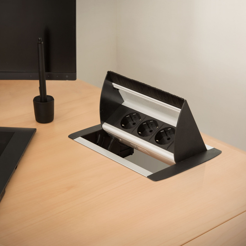 Süllyeszthető elosztó irodai és otthoni felhasználásra, fém házzal, 3 db gyermekvédelemmel ellátott aljzattal. Asztala, bútora legyen mindig elegáns és rendezett, mégis funkcionális. A rejtett elosztó kiváló megoldás lehet ha már például kész konyhával rendelkezik, de nincs elegendő konnektor a kívánt helyen. Ilyenkor falvésés és villamos hálózat bővítés nélkül, remek alternatíva lehet egy rejtett elosztó. Egy mozdulat és máris rendelkezésre áll 3 szabad konnektor. Ideális lehet olyan elektromos eszközökhöz, amit nem folyamatosan használunk, kenyérpirító, vízforraló... Ha használaton kívül vannak, az elosztó egy mozdulattal elrejthető, ezzel is megkönnyítve például a takarítást, valamint rendezett, letisztult külsőt ad a helységnek.