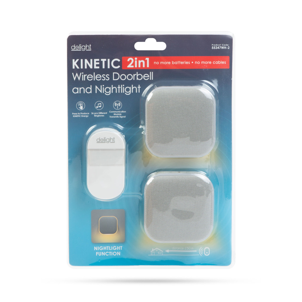 A Delight, elem nélküli csengők legújabb tagja, megújult dizájnnal és funkciókkal megérkezett! Kettő az egyben eszköz, amely használható hagyományos csengőként és fényszenzoros éjjeli fényként is. A vezeték nélküli csengő kapcsolója a dinamó elvén működik. A nyomógombos kapcsoló működtetéséhez nincs szükség semmilyen külső áramforrásra. A működéshez szükséges elektromos áramot a kapcsolóban található dinamó hozza létre. Az innovatív KINETIC - elem- és vezeték nélküli - technológiának köszönhetően nincs többé szükség elemre a termék működtetéséhez.