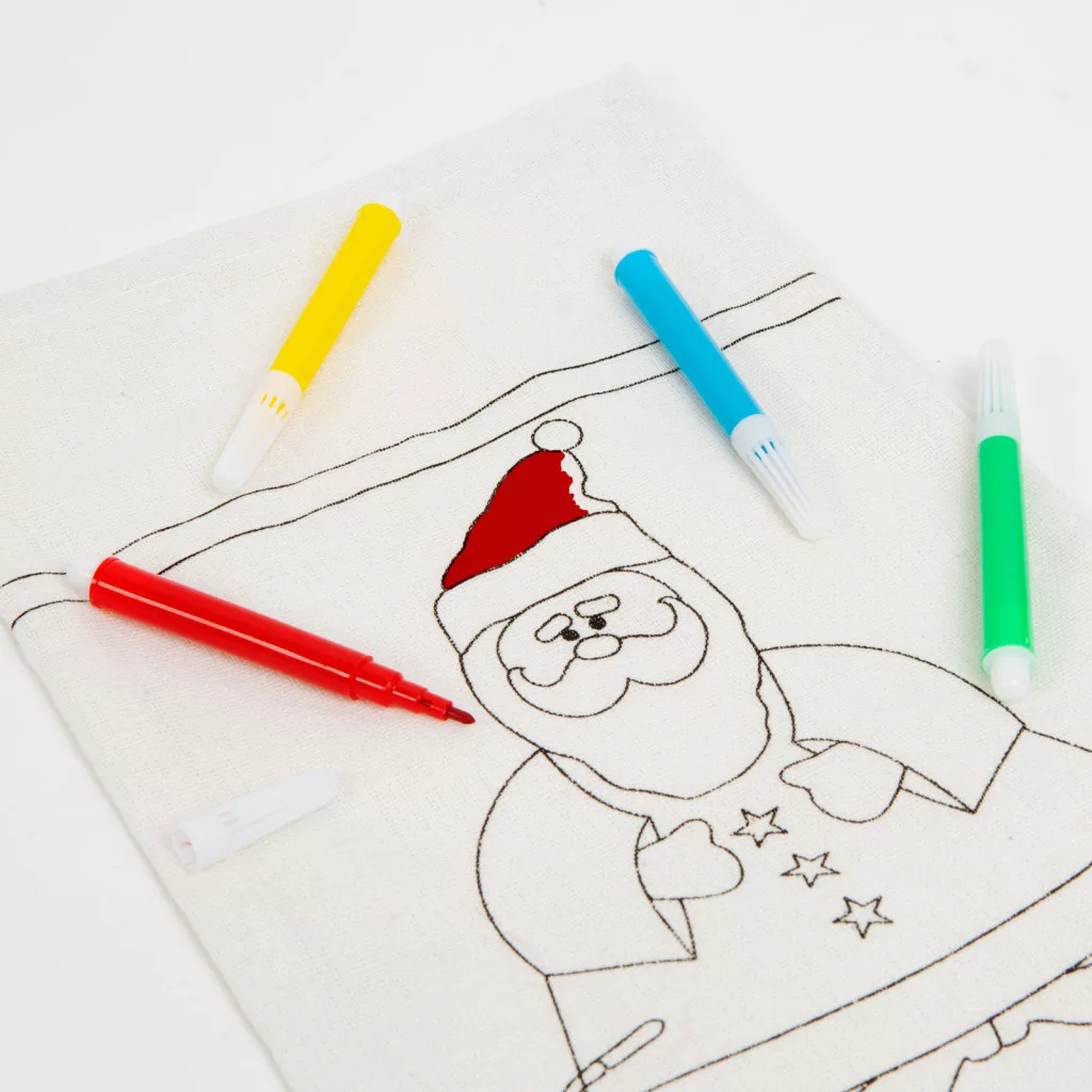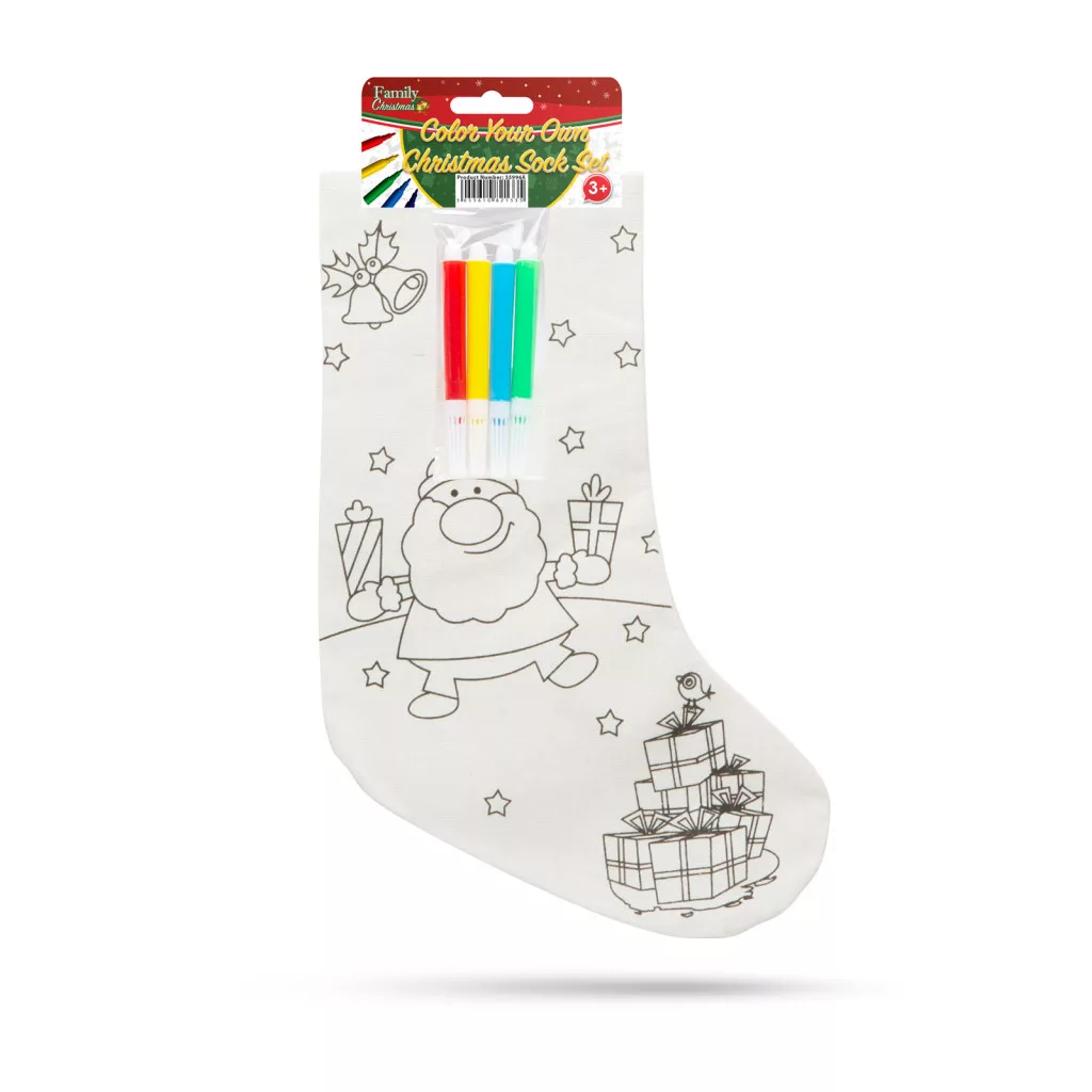 Színezd magad mikulás zokni színes filctoll készlettel. Kettő az egyben: mikulás zokni és foglalkoztató gyerekeknek. Színezéskor a zokni két anyaga közé vastagabb papírt kell tenni, hogy a hátoldalra ne kerüljön festék.