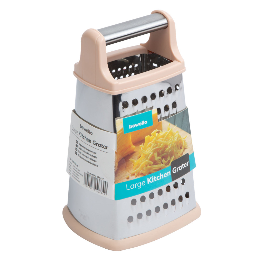 4 oldalú konyhai reszelő, amely nem hiányozhat egyetlen konyhából sem. A rozsdamentes acélból készült anyagnak köszönhetően tartós, strapabíró eszköz, amely segítségével hatékonnyá válnak a reszelési, aprítási műveletek. Kialakítása lehetővé teszi, hogy mind a négy oldalon különböző módon reszelje az összetevőket, így egyetlen eszközzel számtalan feladatot elvégezhet. Az ergonomikus fogantyú biztosítja a kényelmes és stabil tartást, míg az alján található gumitalpak garantálják a biztonságos használatot.