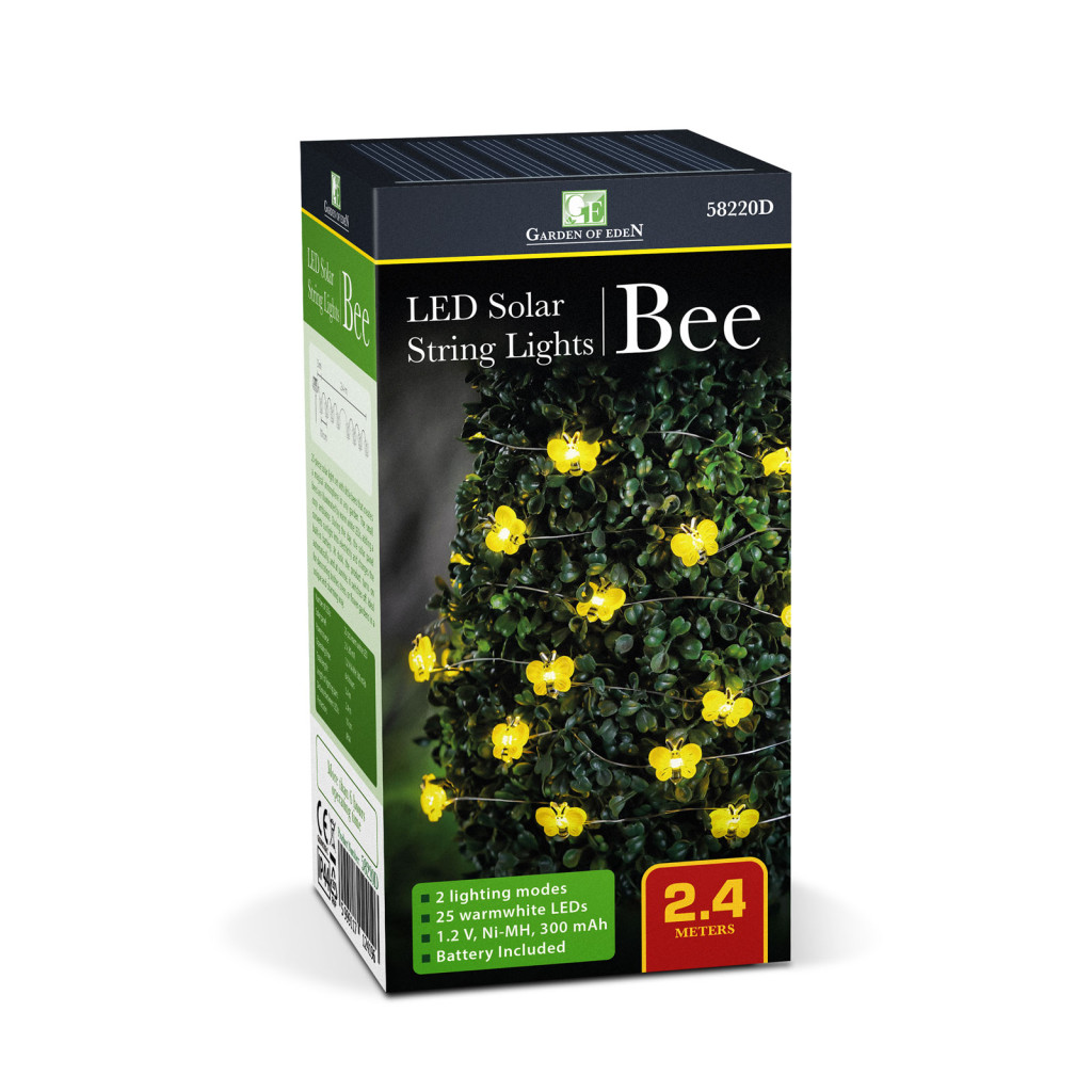25 db méhecskéből álló napelemes lámpa szett, amely varázslatos hangulatot teremt bármely kertben. A kis méhecskéből melegfehér LED-ek világítják meg, ezzel teremtve kellemes hangulatot. A nap folyamán a szolár panel a napfényt elektromos árammá alakítja és feltölti a beépített akkumulátort. Szürkületkor a termék automatikusan bekapcsol, napfelkeltekor pedig ki. Ideális lehet bármilyen kertben, bokrok, fák, virágoskertek egyedi és különleges dekorálására.