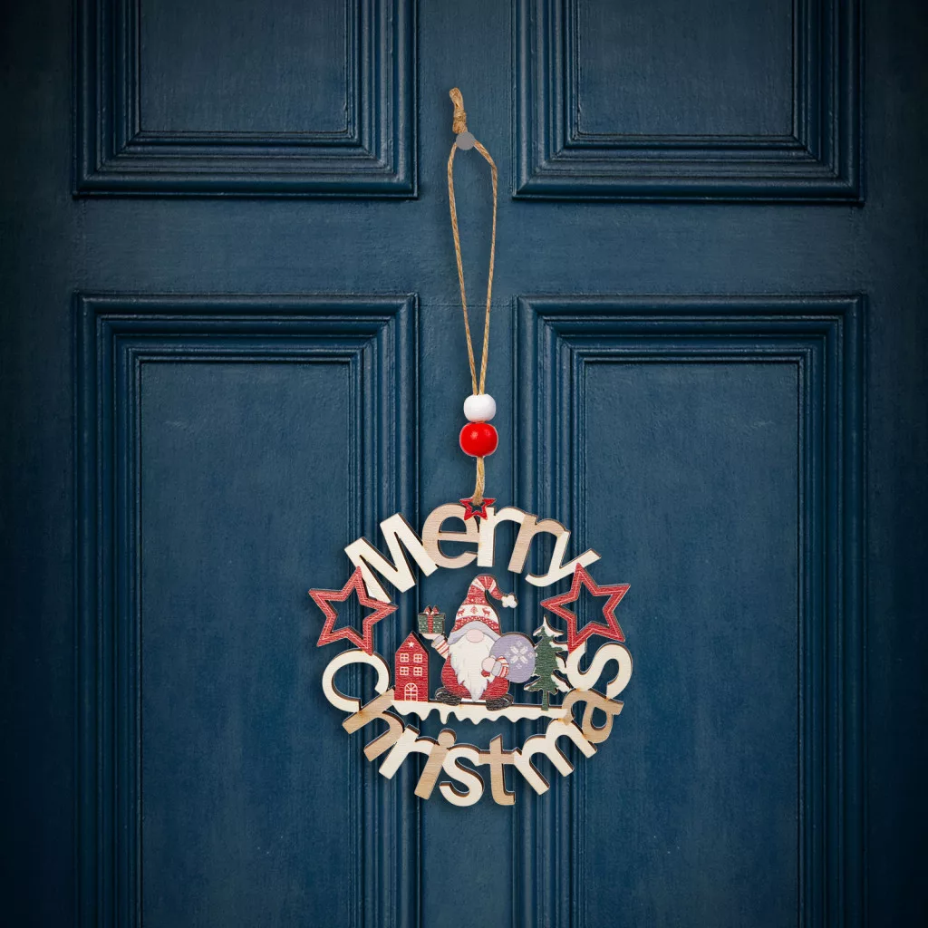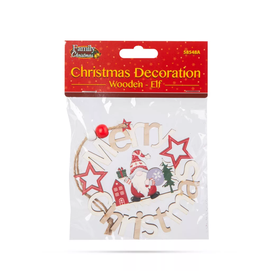 Ez a gyönyörű fából készült manó figurás dísz tökéletes kiegészítője lehet a karácsonyi dekorációnak otthonában. Szépen kidolgozott, aranyos manó figurák, amelyek "Merry Christmas" feliratban állnak, ami az ünnepi hangulatot és vidámságot sugallja. A fából készült díszek, melegséget és természetességet kölcsönöznek bármilyen ünnepi dekorációnak. A kidolgozott, részletesgazdag festés gondoskodik az aprólékos és szemet gyönyörködtető megjelenésről. A figura egy erős, de könnyű fából készült darab, amely felakasztható az otthona különböző pontjain.