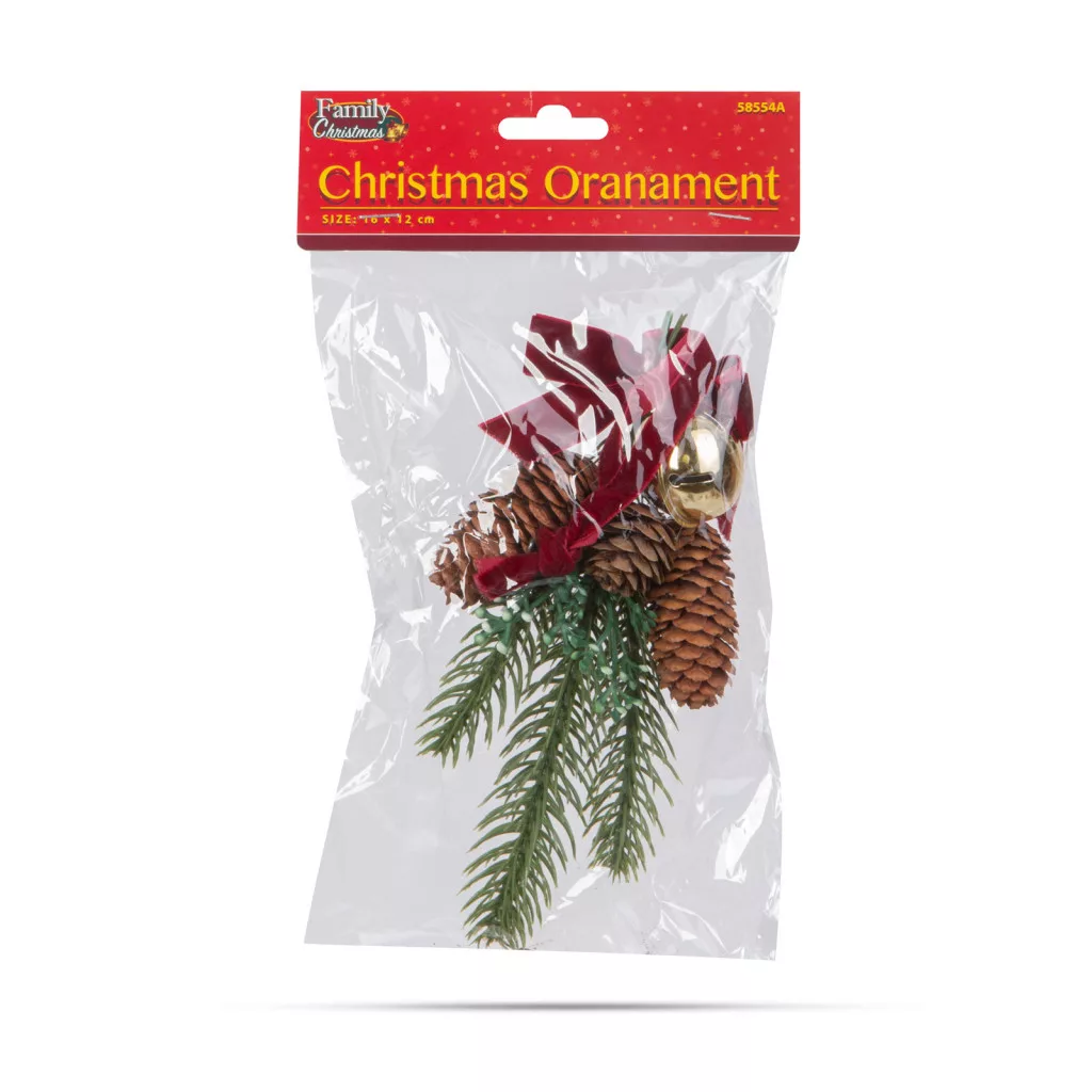 Karácsonyi ajtódekoráció - műfenyő, tobozzal, arany csengettyűvel - 16 x 15 cm