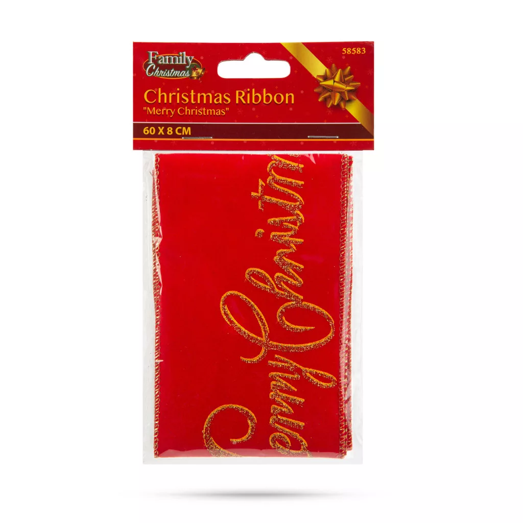 Szín: Piros szalag, arany színű "Merry Christmas" felirattal