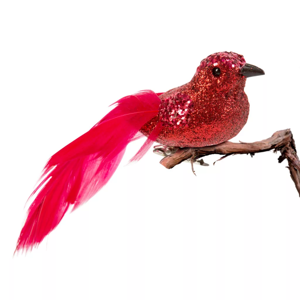 Különleges karácsonyi dekorációs termék, amely csipesz segítségével rögzíthető. A madár csillámos, glitteres felülettel rendelkezik, tollait csillogó szalag díszíti.