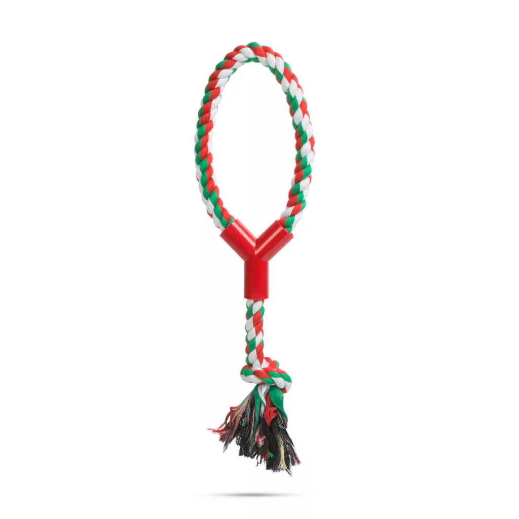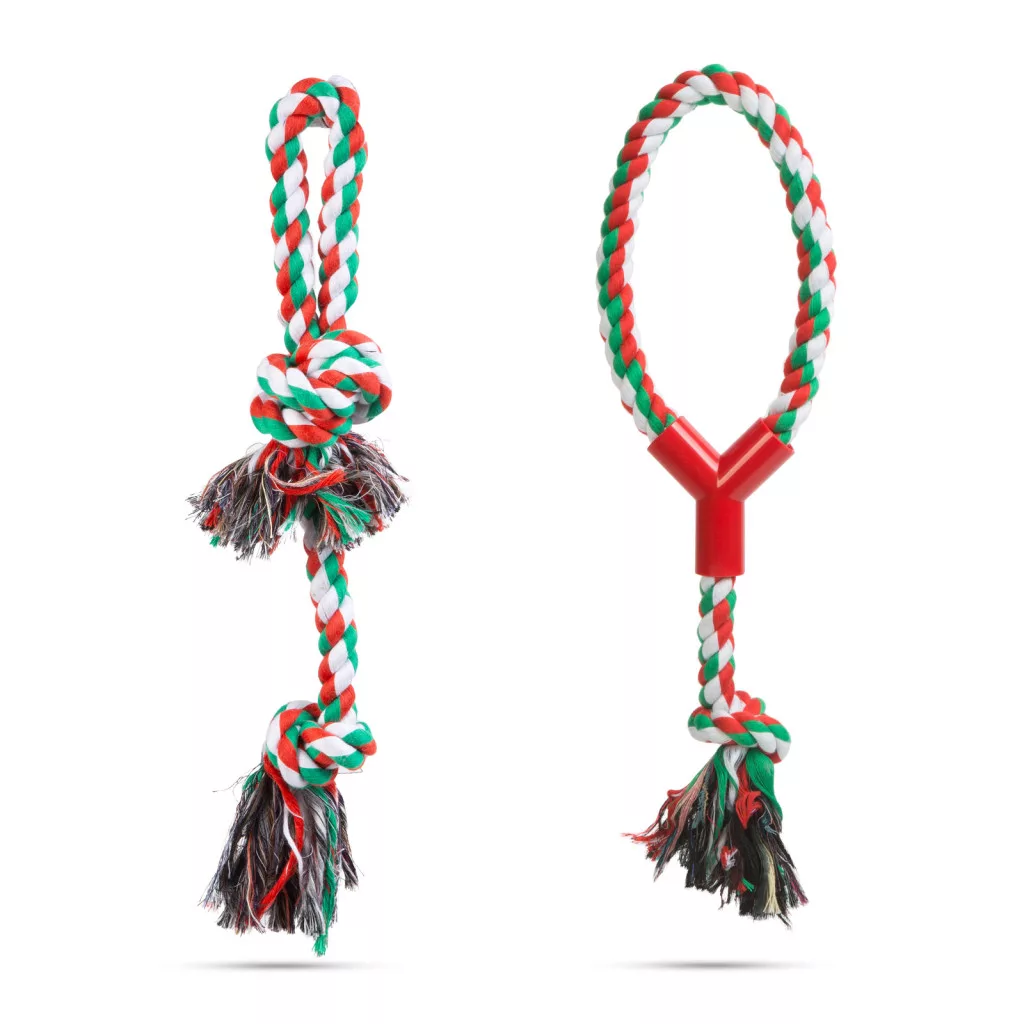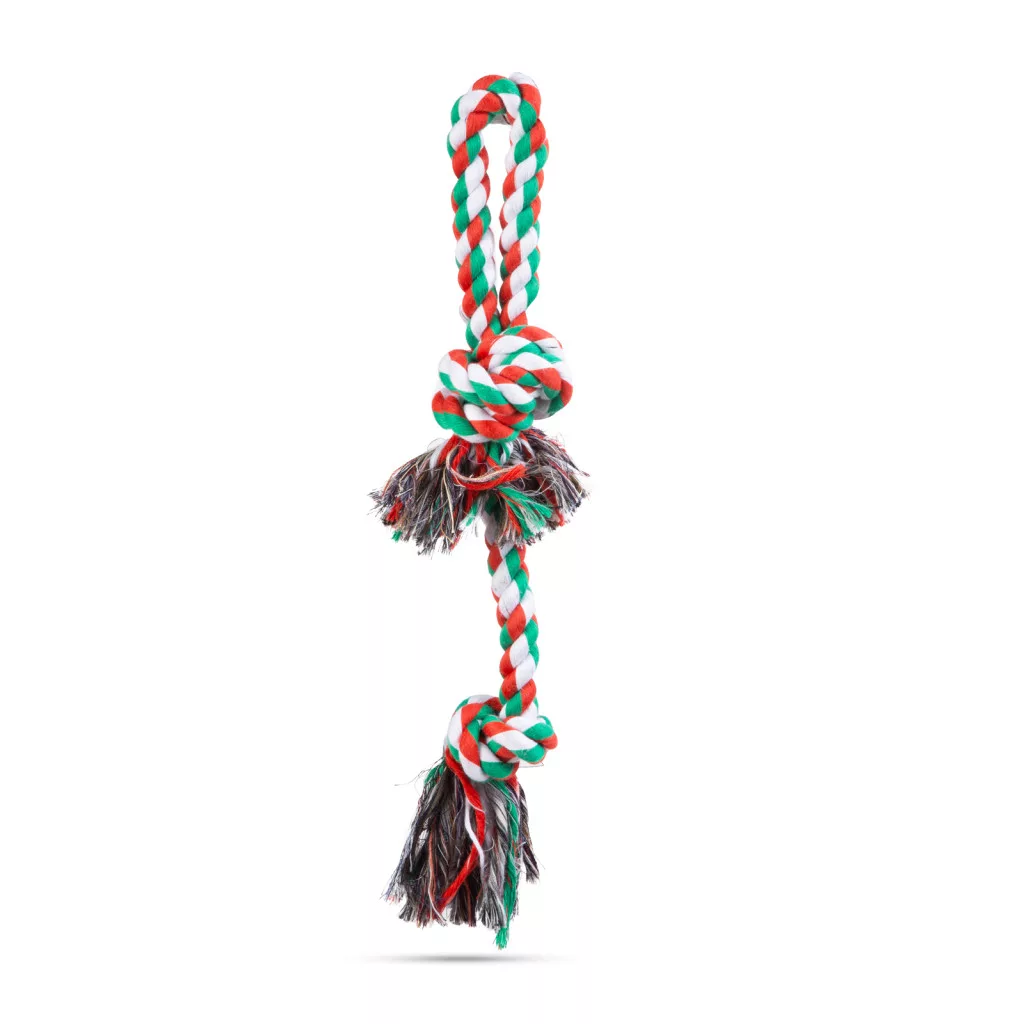 A karácsonyi lázból és dekorációból nem maradhatnak ki a házikedvencek sem. Ez a színes kötélből készült játék, rágóka nem csak kiskutyánk kedvence lesz, de az ünnepi eneteriőr részét is képezi majd.