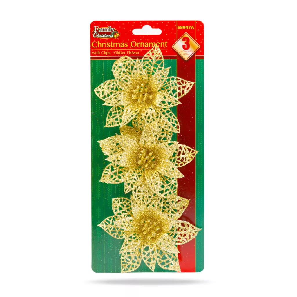 Karácsonyi dísz - csipeszes - glitteres virág - arany - 3 db / csomag