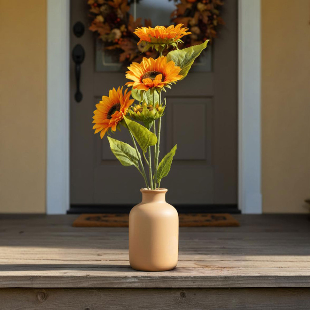 Varázsolja otthonába az ősz meleg és barátságos hangulatát ezzel az elegáns, élethű napraforgó dekorációval! A 90 cm magas szár három gyönyörű, citromsárga virágfejet tart, amelyek részletgazdag kidolgozásuknak köszönhetően természetes hatást keltenek. Ez a dekoratív napraforgó kiváló választás lehet vázákba, őszi kompozíciókhoz, például bejárat, étkező vagy a lakás bármely életterének díszítésére. Tartós anyagból készült, így hosszú ideig megőrzi szépségét és színét, bármilyen belső térben.
