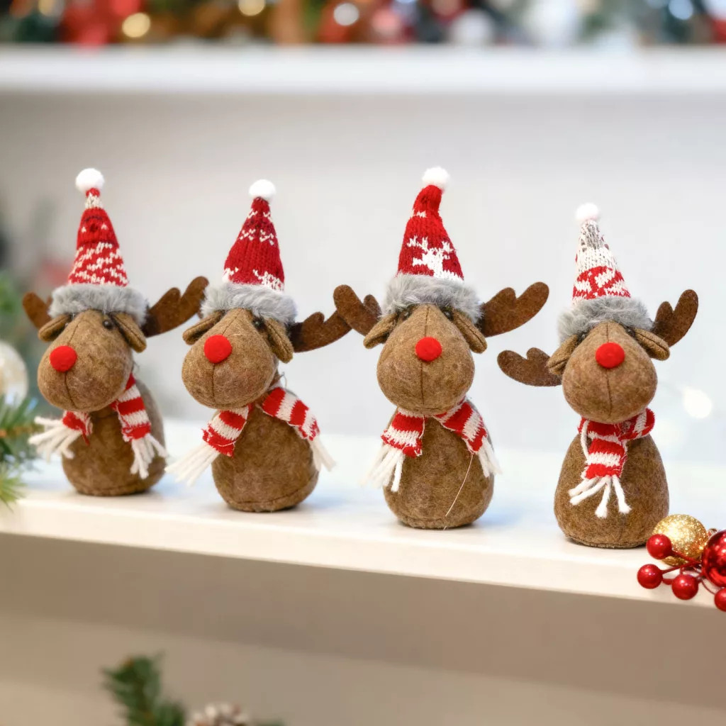 Varázsoljon ünnepi hangulatot otthonába ezekkel a bájos rénszarvas figurákkal! A 18 cm magas dekorációs figurák, jól mutatnak íróasztalon, polcon asztalon, vidámságot csempészve mindennapjaiba. Piros-fehér mintázatú sapkáikkal tökéletesen illeszkednek az ünnepi enteriőrbe.