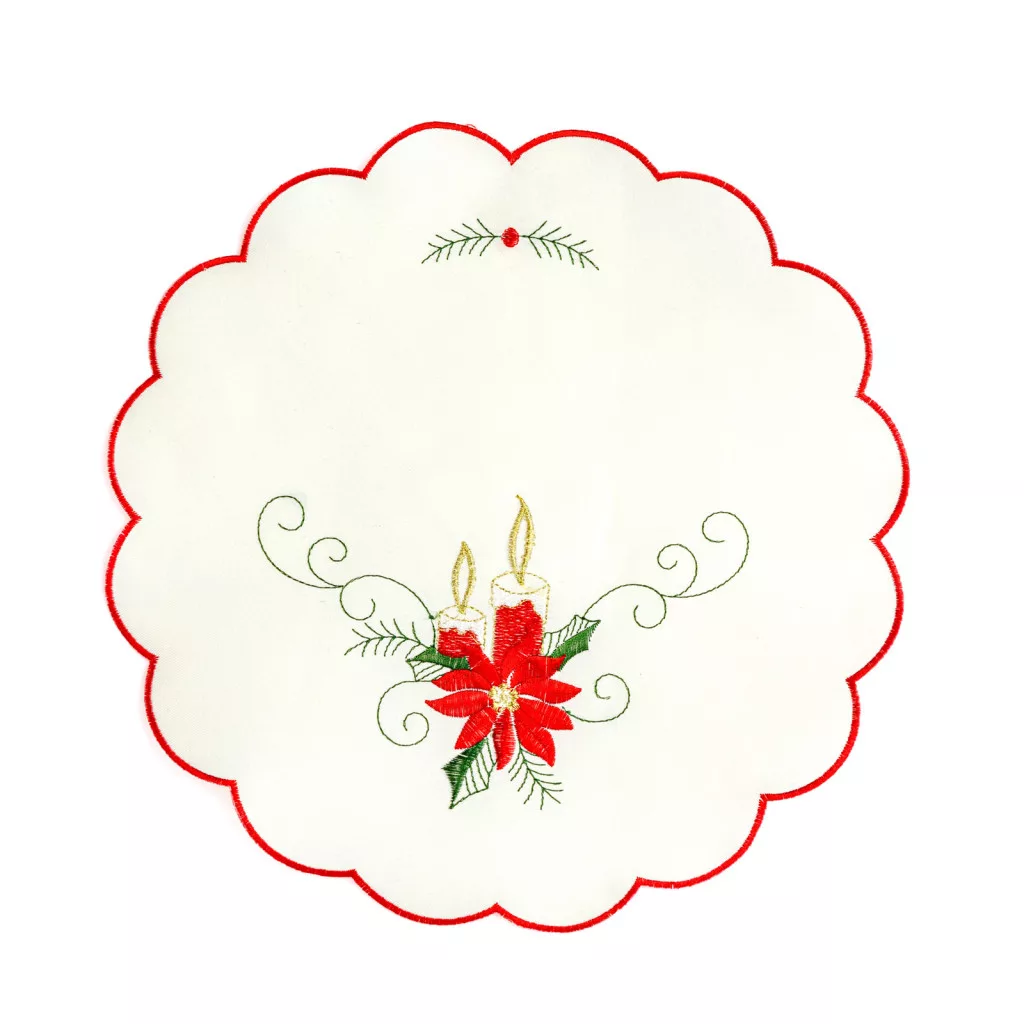 Ez a klasszikus, hímzett karácsonyi asztalterítő tökéletes választás az ünnepi hangulat megteremtéséhez. A kerek forma, a piros szegély és a részletgazdag hímzett minták – csengő, gyertya, gömbdísz és fagyöngy – elegáns megjelenést kölcsönöznek bármely asztalnak. A 29 cm átmérőjű terítő ideális asztalokra, komódokra vagy dekorációs tálak alá.