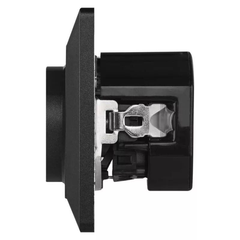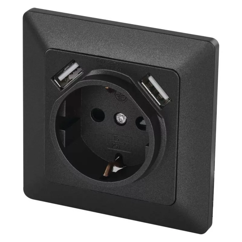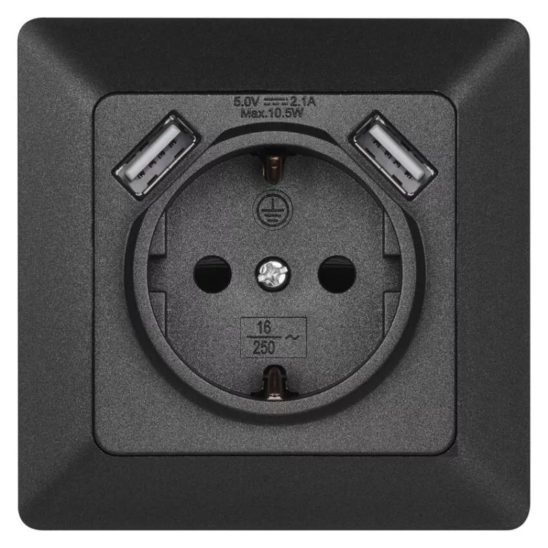 dizájn: SCHUKO|értékesítési csomagolás: 1 db, PE csomag|feszültség: 250 V~/16 A max.|összeszerelés módja: dobozba (további mélység min. 40 mm)|szín: anthracite|termék: egyszeres dugalj védőtüskével oldalsó és USB kimenettel, 2,1 A max.|típus: szimpla|védettség: IP20