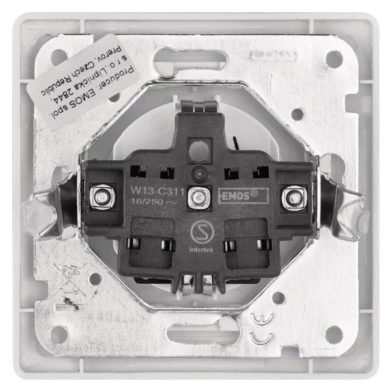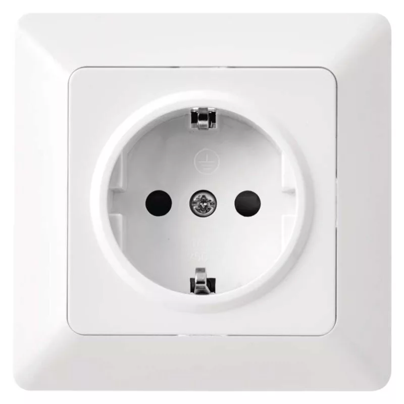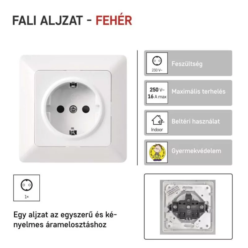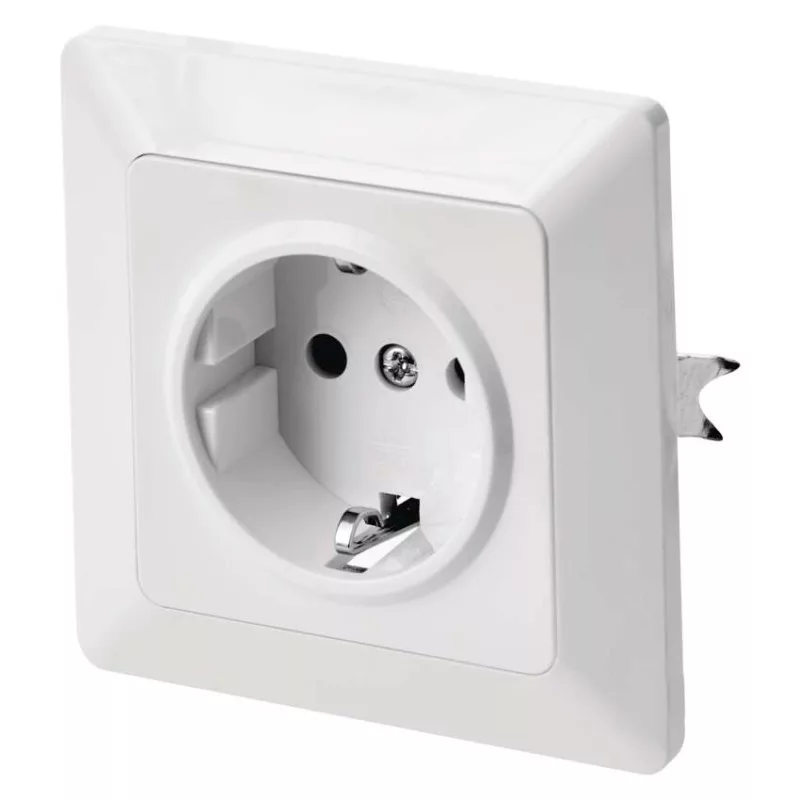 dizájn: SCHUKO|értékesítési csomagolás: 1 db, akasztható|feszültség: 250 V~/16 A max.|összeszerelés módja: dobozba|szín: fehér (fényes)|termék: egyszeres dugalj védőtüskével oldalsó|típus: szimpla|védettség: IP20