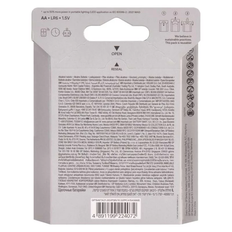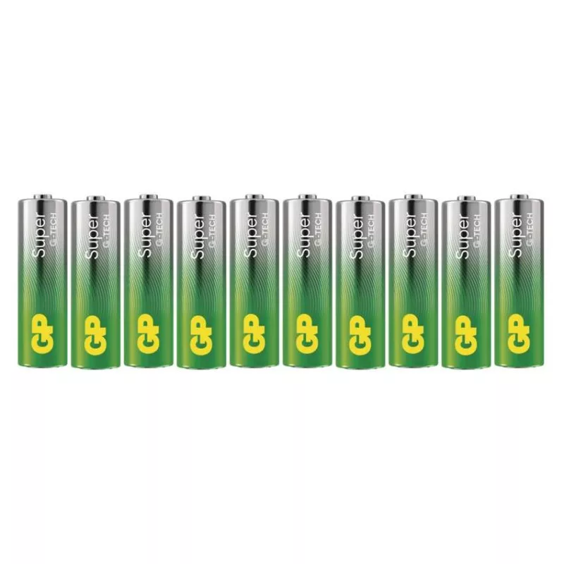 akkumulátor mérete: AA|értékesítési csomagolás: 10 db, kis papír doboz|feszültség: 1,5 V|kapacitás: nincs megadva|kategória/sorozat: Super Alkaline|kémiai összetétel: alkáli|márka: GP|max. tárolási idő: 10 év|méretek: 14,5 × 50,5 mm|súly: 23 g|típus: LR6 (AA ceruza)|töltési ciklusok száma: nem tölthető|tölthető: nem|üzemi hőmérséklet: -18 °C és +50 °C