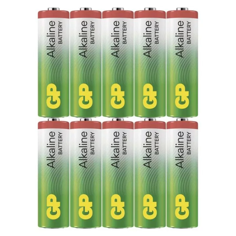 akkumulátor mérete: AA|értékesítési csomagolás: 10 db, fólia|feszültség: 1,5 V|kapacitás: nincs megadva|kategória/sorozat: Alkaline|kémiai összetétel: alkáli|márka: GP|max. tárolási idő: 10 év|méretek: 14,5 × 50,5 mm|súly: 23 g|típus: LR6 (AA ceruza)|töltési ciklusok száma: nem tölthető|tölthető: nem|üzemi hőmérséklet: -18 °C és +50 °C