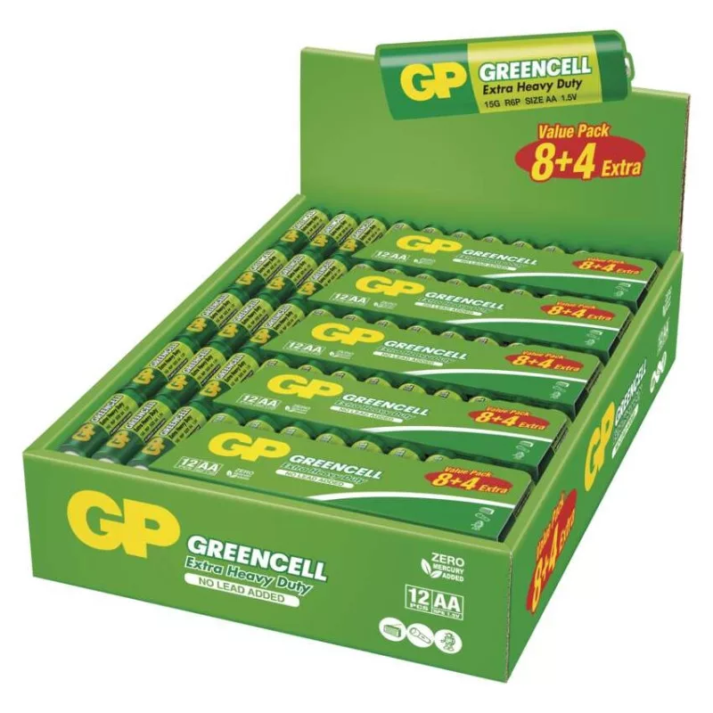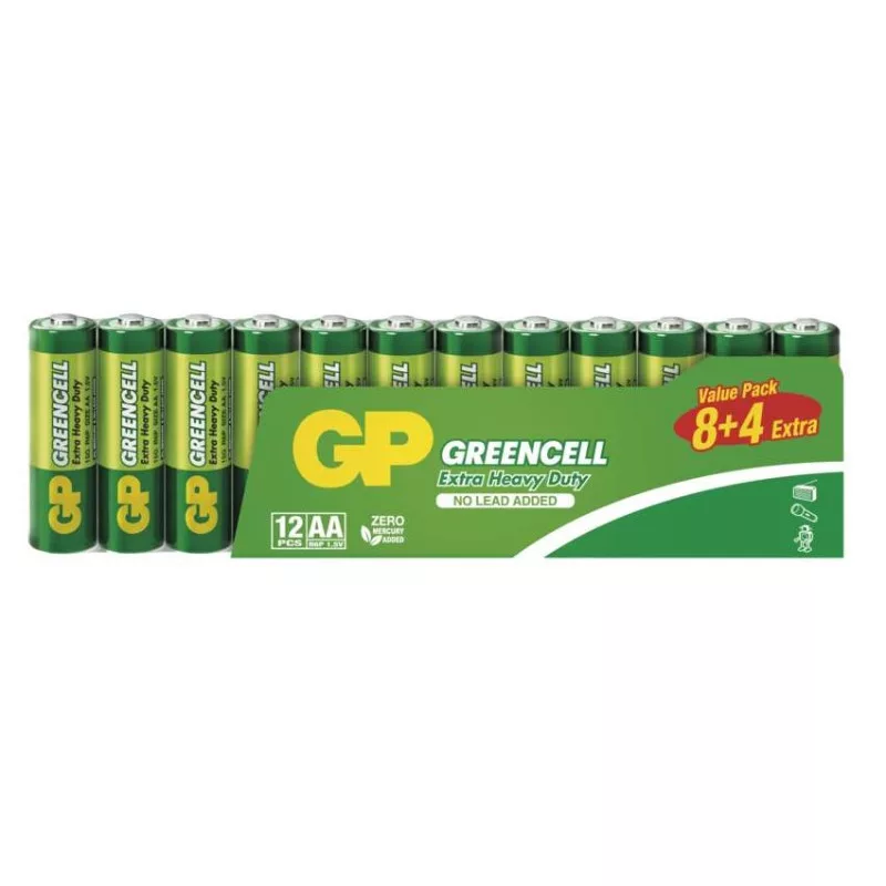 akkumulátor mérete: AA|értékesítési csomagolás: 12 db, fólia|feszültség: 1,5 V|kapacitás: nincs megadva|kategória/sorozat: Greencell|kémiai összetétel: cink-klorid|márka: GP|max. tárolási idő: 3 év|méretek: 14,5 × 50,5 mm|súly: 17,3 g|típus: R6 (AA ceruza)|töltési ciklusok száma: nem tölthető|tölthető: nem|üzemi hőmérséklet: 0 °C és +45 °C