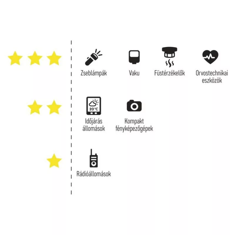 Megbízható és kimagasló teljesítmény maximális fogyasztás mellett akár 7-szer nagyobb teljesítmény a hasonló méretű általános alkálielemekkel összehasonlítva. Különösen hosszú, akár 10 éves eltarthatósági idő.