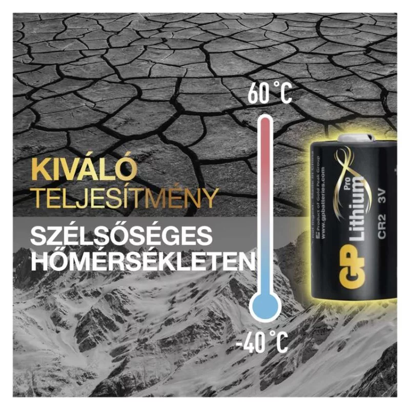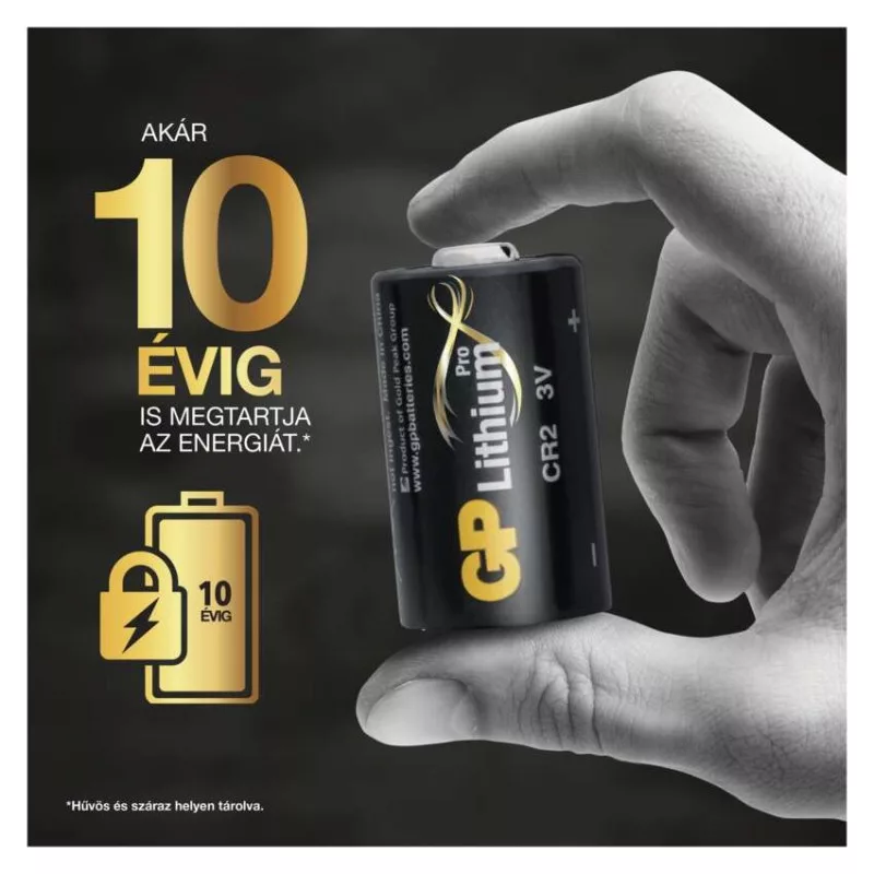 akkumulátor mérete: nincs megadva|értékesítési csomagolás: 1 db, bliszter|feszültség: 3 V|kapacitás: 800 mAh|kategória/sorozat: Lithium|kémiai összetétel: lítium|márka: GP|max. tárolási idő: 10 év|méretek: 15,3 × 26,5 mm|súly: 10 g|típus: CR2 (DLCR2)|töltési ciklusok száma: nem tölthető|tölthető: nem|üzemi hőmérséklet: -40 °C és +60 °C