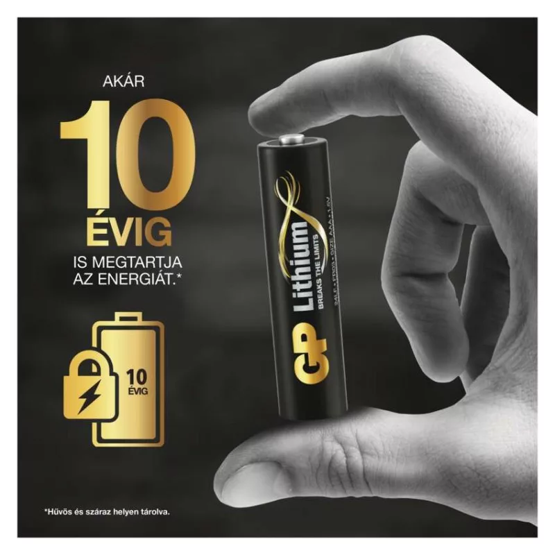 akkumulátor mérete: AAA|értékesítési csomagolás: 2 db, bliszter|feszültség: 1,5 V|kapacitás: nincs megadva|kategória/sorozat: Lithium|kémiai összetétel: lítium|márka: GP|max. tárolási idő: 10 év|méretek: 10,5 × 44,5 mm|súly: 7,5 g|típus: FR03 (AAA mikroceruza)|töltési ciklusok száma: nem tölthető|tölthető: nem|üzemi hőmérséklet: -40 °C és +60 °C
