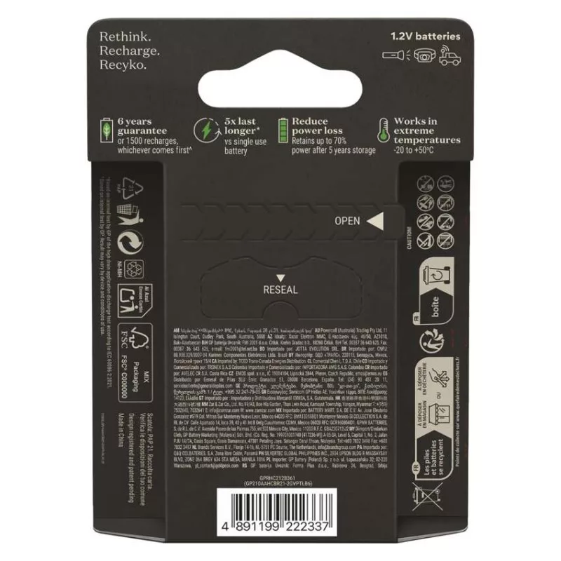 akkumulátor mérete: AA|értékesítési csomagolás: 6 db, kis papír doboz|feszültség: 1,2 V|kapacitás: 2 000 mAh|kategória/sorozat: ReCyko Pro|kémiai összetétel: NiMH|márka: GP|max. tárolási idő: nincs megadva|méretek: 14,5 × 50,5 mm|súly: 30 g|típus: HR6 (AA ceruza)|töltési ciklusok száma: több, mint 1 500|tölthető: igen|üzemi hőmérséklet: -20 °C és +50 °C
