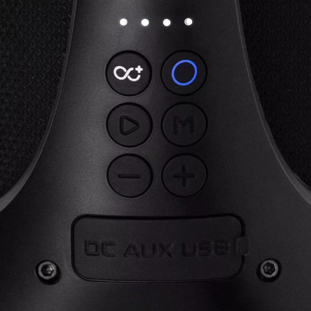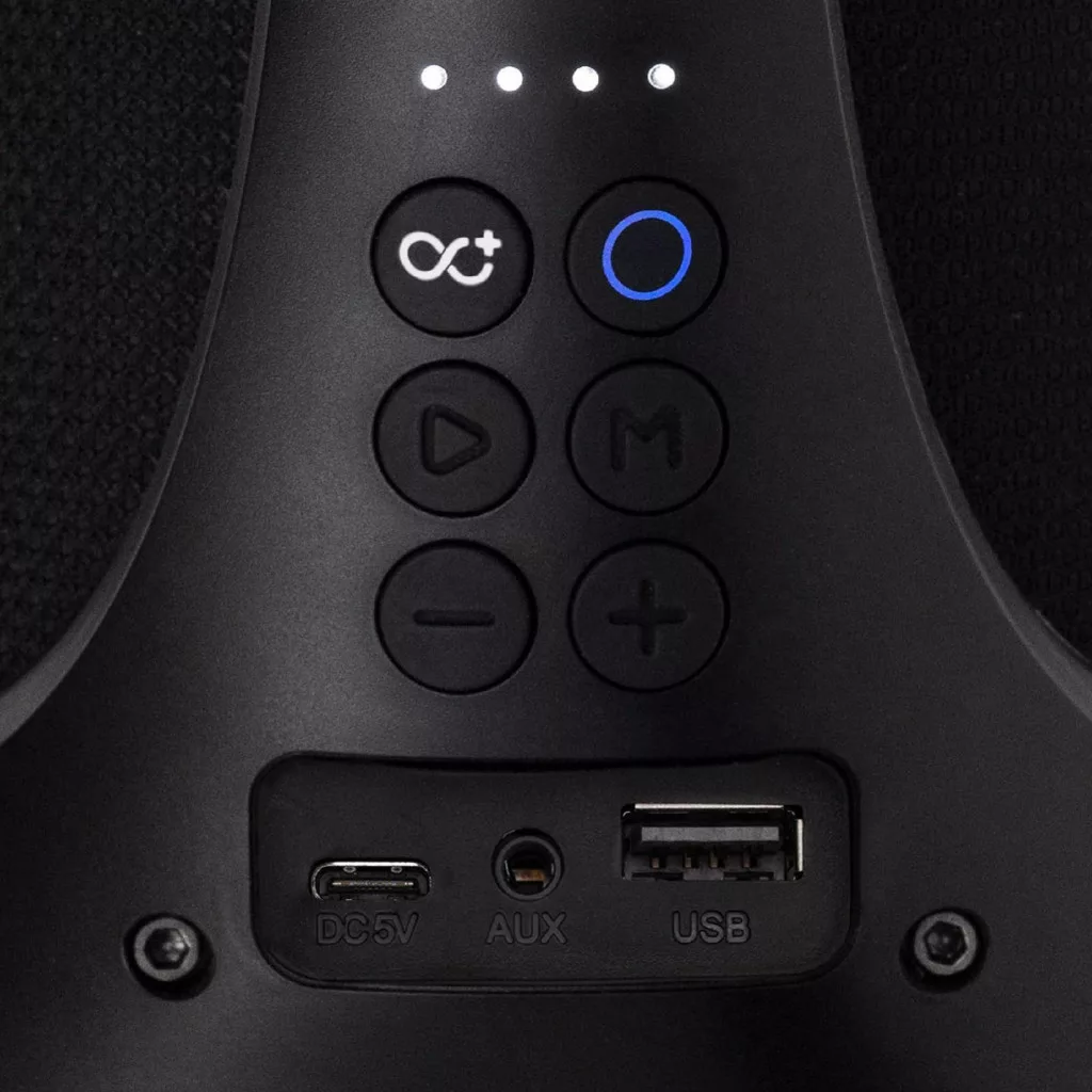 A SAL BT 5000 a 2.0 sztereó + Dual-Bass hangsugárzókkal erőteljes, térhatású hangzást biztosít. Az 50 W összteljesítmény és az IPX5 vízvédelem révén ideális beltéri és kültéri használatra egyaránt. Két azonos eszköz vezeték nélkül párosítható, így még nagyobb hangerőt és kiterjesztett sztereó élményt érhet el.