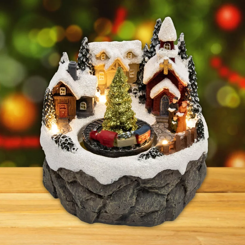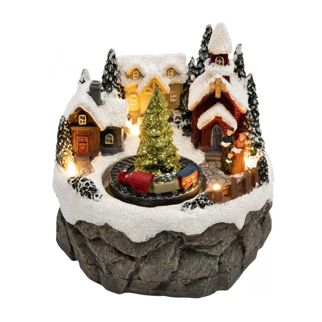 Világító karácsonyi életkép, templommal, vonattal.