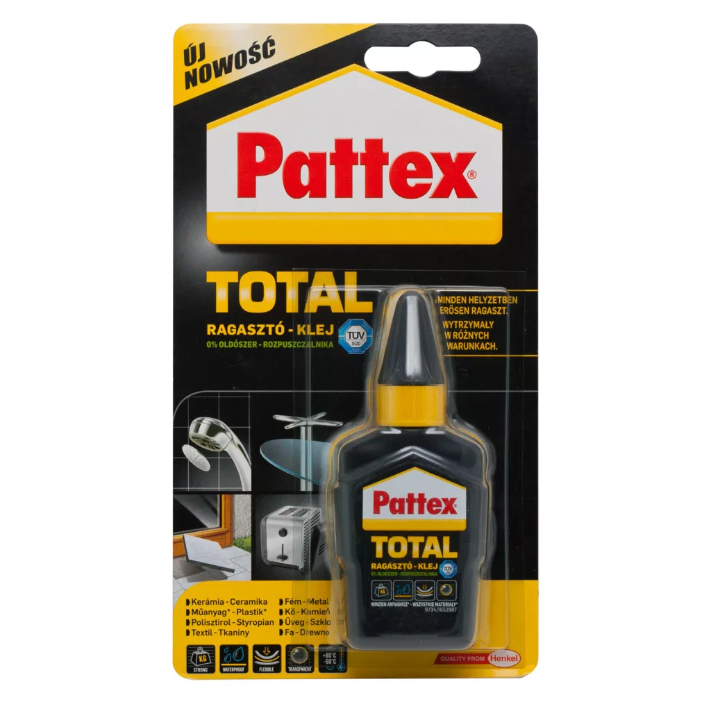 Hatékony minden körülmények között. Akár a házban, akár a ház körül, a Pattex TOTAL biztosítja a szükséges erőt a mind a kültéri, mind a beltéri munkáihoz. Nedves felületeken is tapad, és festett felületen is használható. A 100%-ban aktív összetevők és a 0% oldószer a legjobb teljesítményt nyújtja a szabadalmaztatott FlexTec technológiával. TüV minősítés. Pattex 100%-ban alkalmas minden barkácsolási tevékenységre! Ragasztja többek között a következő anyagokat: Vakolat, Horganyzott lemez, Fém, Beton, Alumínium, Hungarocell, Kerámia, Szilárd purhab, üveg, Kő, Bőr, Műanyag, PVC, Textil, Szövet, Parafa, Bőr, Vas, Fa, Acél stb.