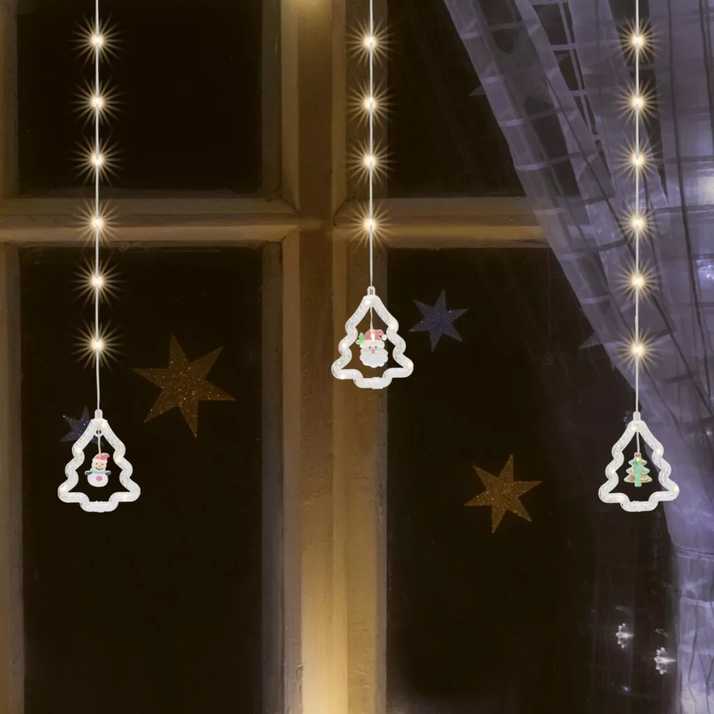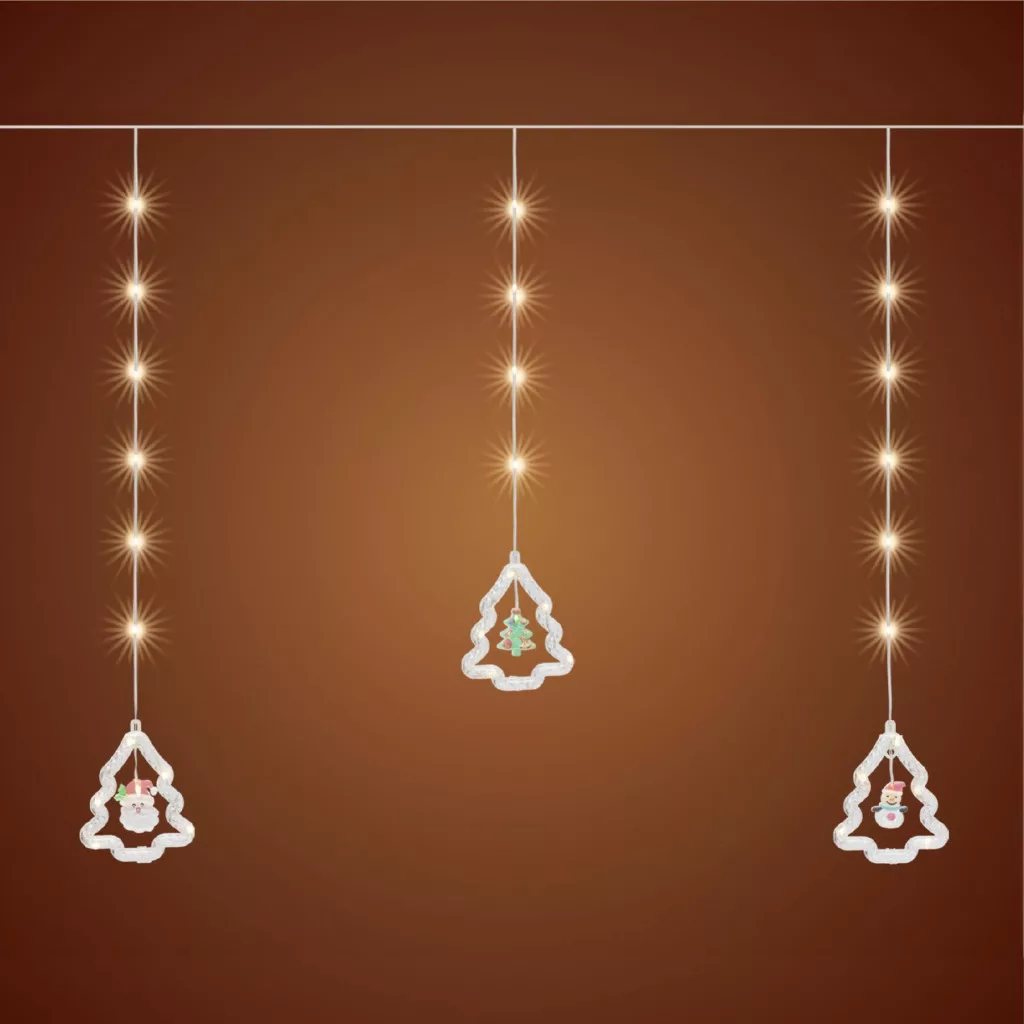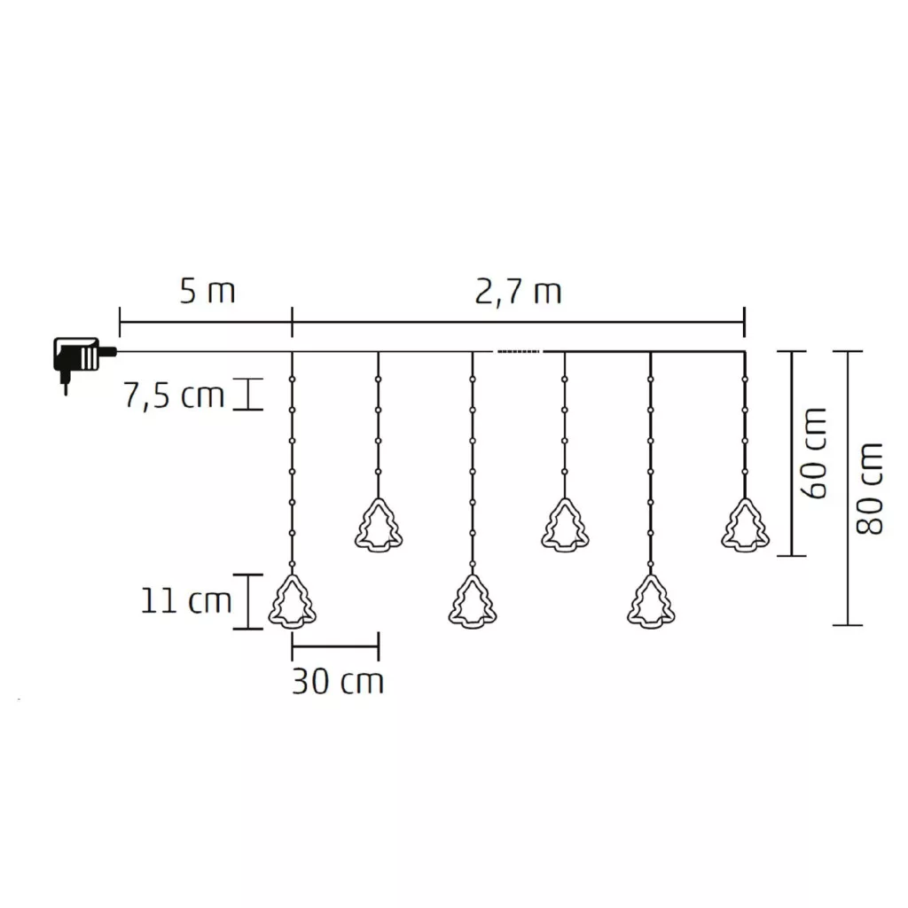 A fényfüggöny világítási módja állandó, így folyamatos meleg fényárban úszik. A 2,7 méter hosszú füzért 5 méteres tápkábel követi az adapterig, amely IP44-es kültéri védelemmel rendelkezik, biztosítva a biztonságos használatot bármilyen időjárási körülmények között. A füzérek közti távolság 30 cm, míg a fenyő figura magassága 11 cm. A gerinctől a lelógások hossza a figurák aljáig 60 cm és 80 cm, ami lenyűgöző látványt nyújt.